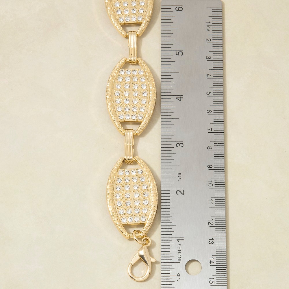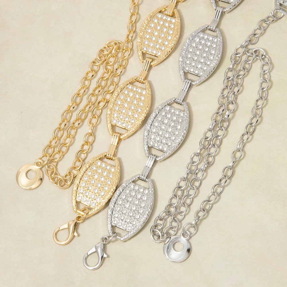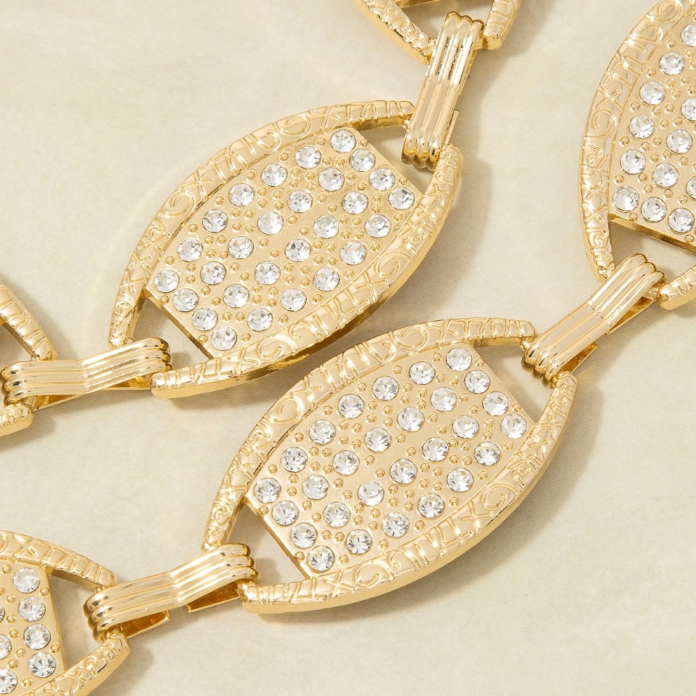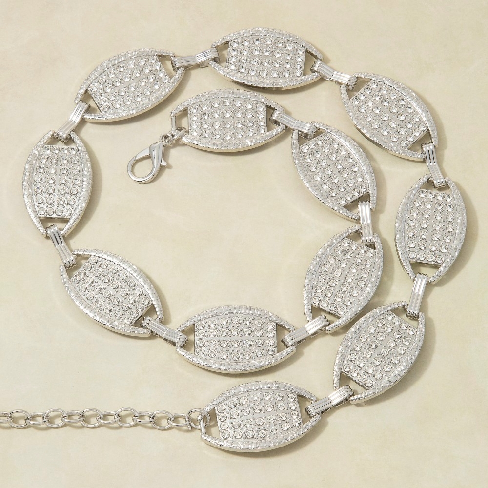 - Add some edge to your wardrobe, this chain belt features a distinct gold cubic zirconia pave oval medallion link design. This chain belt is the perfect finishing touch to any outfit, adding a touch of sophistication and glamour. Available in G, S. This item is sold in packs of 1.