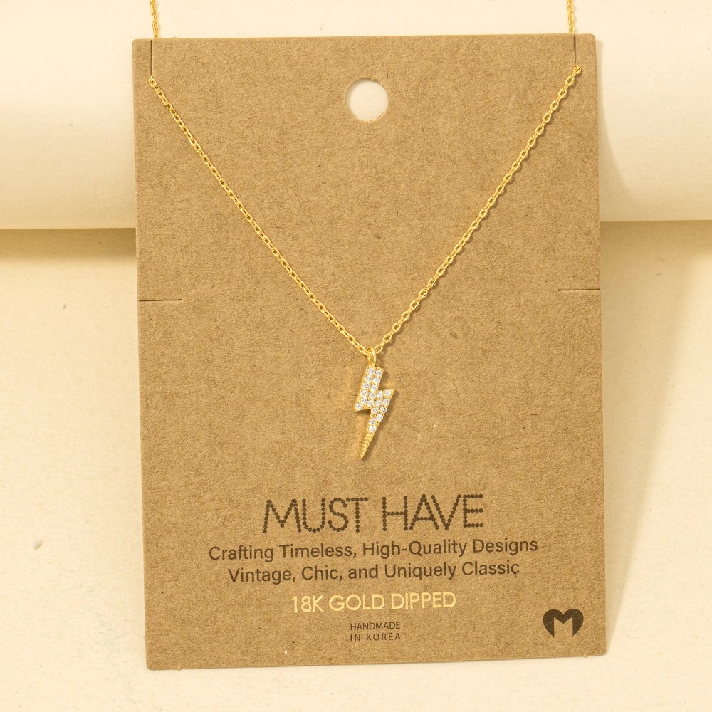 - Make a bold statement, this trending necklace encompasses a grand gold dipped cubic zirconia lightning bolt necklace design. Redefine your fashion identity with this versatile trending necklace, a timeless piece that complements any wardrobe. Available in G, R, S. This item is sold in packs of 1.