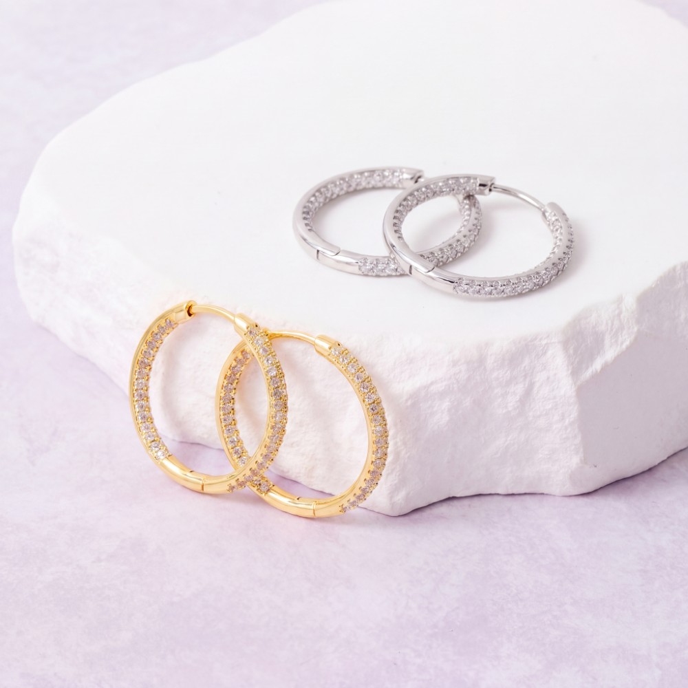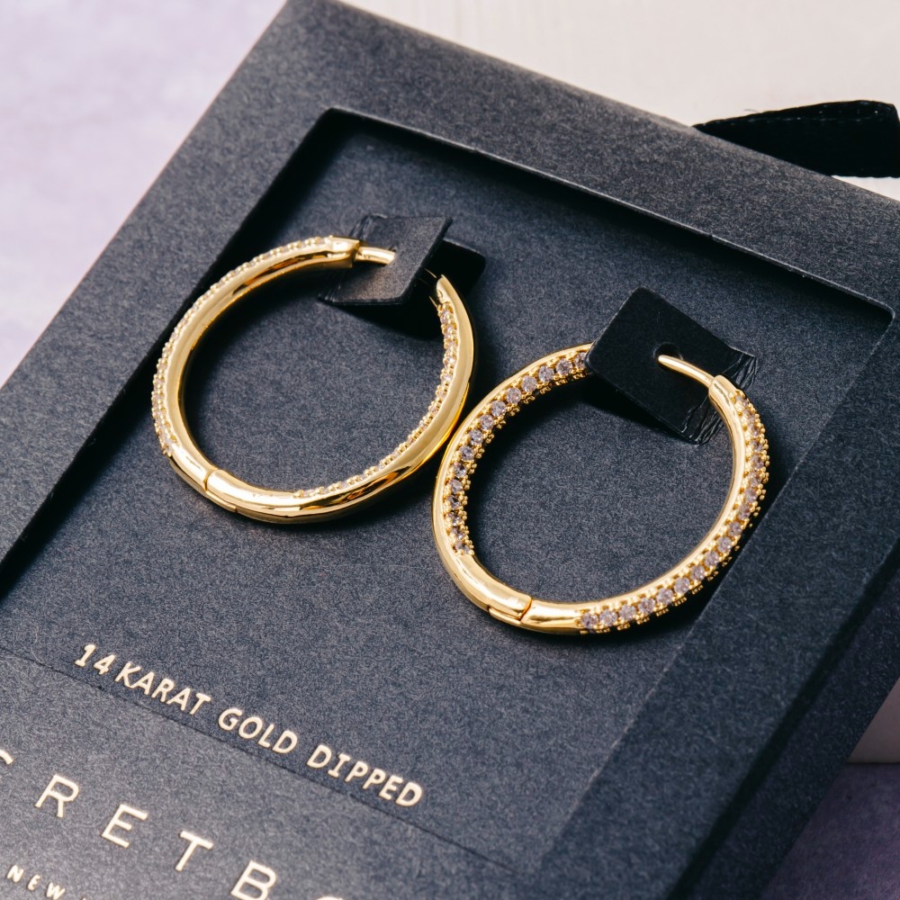 - A stunning addition to any jewelry collection, this pair of hoop earrings presents a striking gold dipped cubic zirconia textured tube design. This item is ideal for those who want to add some personality to their outfits without being too bold. Available in GD, WG. This item is sold in packs of 1.