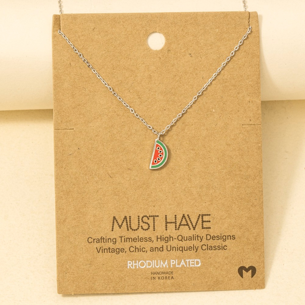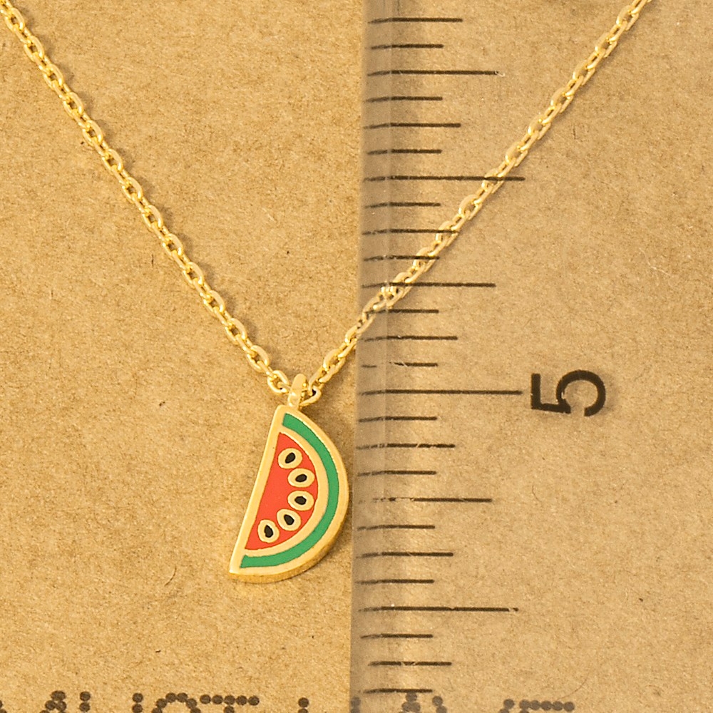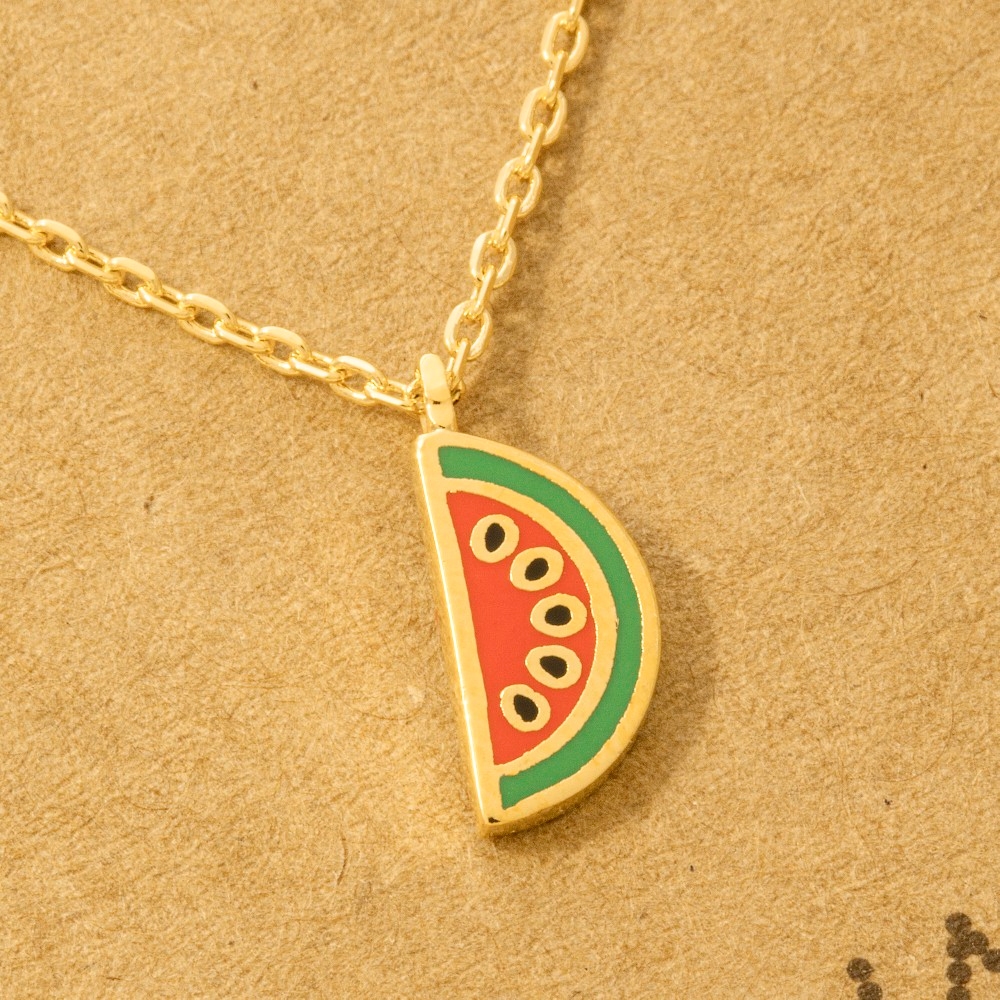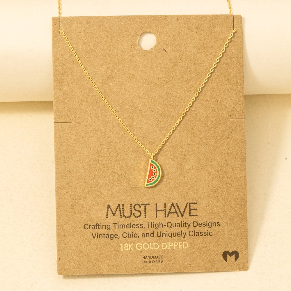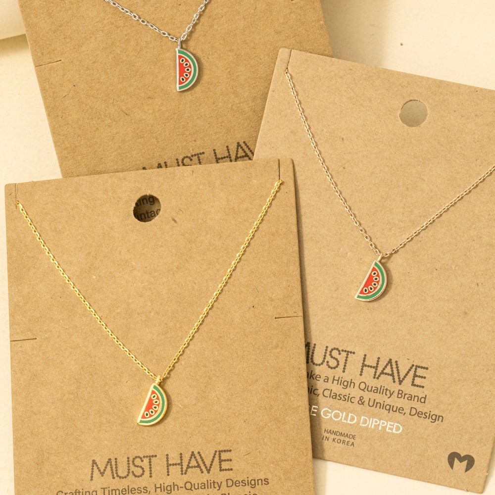 A contemporary masterpiece, this necklace showcases a breathtaking gold dipped epoxy watermelon pendant design. Infuse your ensemble with a touch of sophistication using this versatile necklace, a game-changer in the world of fashion. Available in G, R, S. This item is sold in packs of 1.