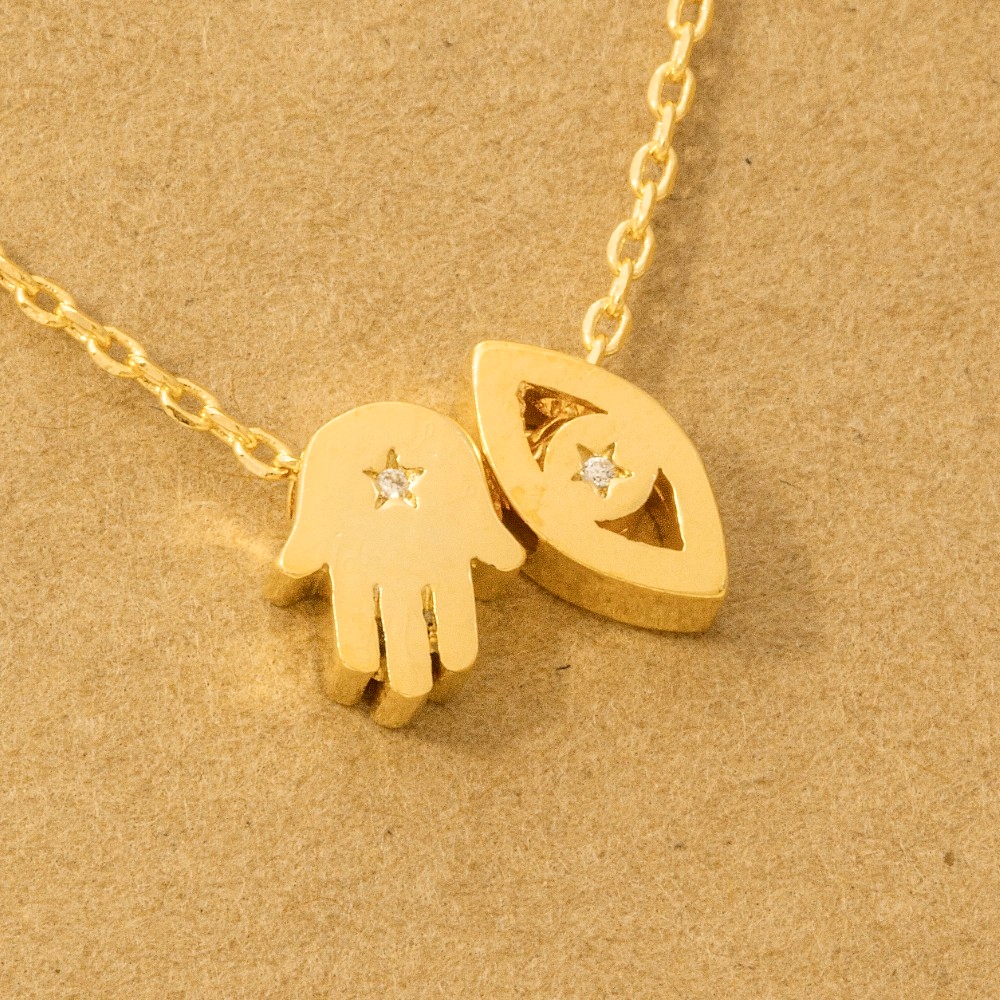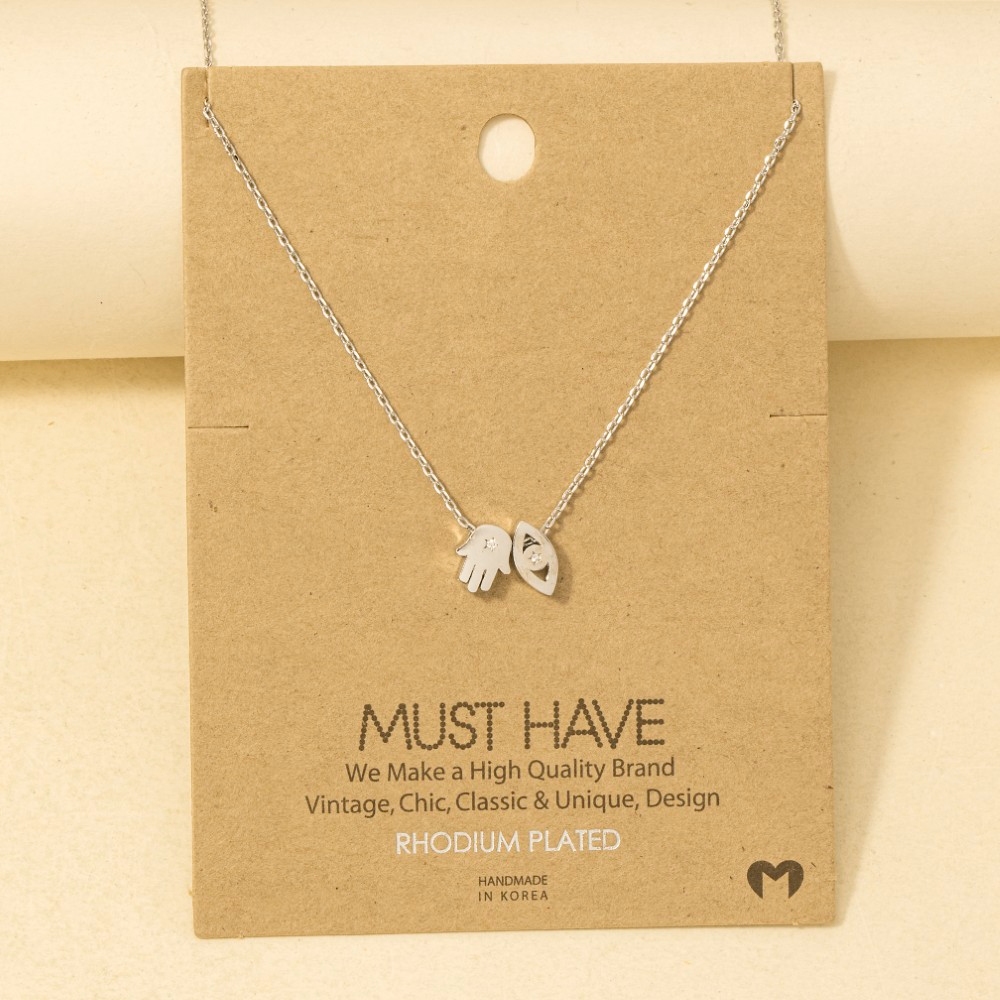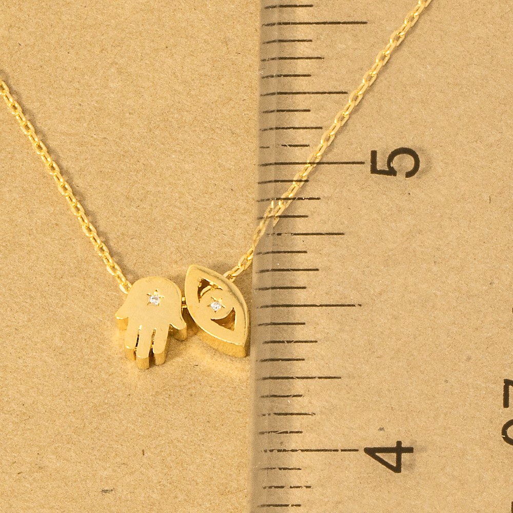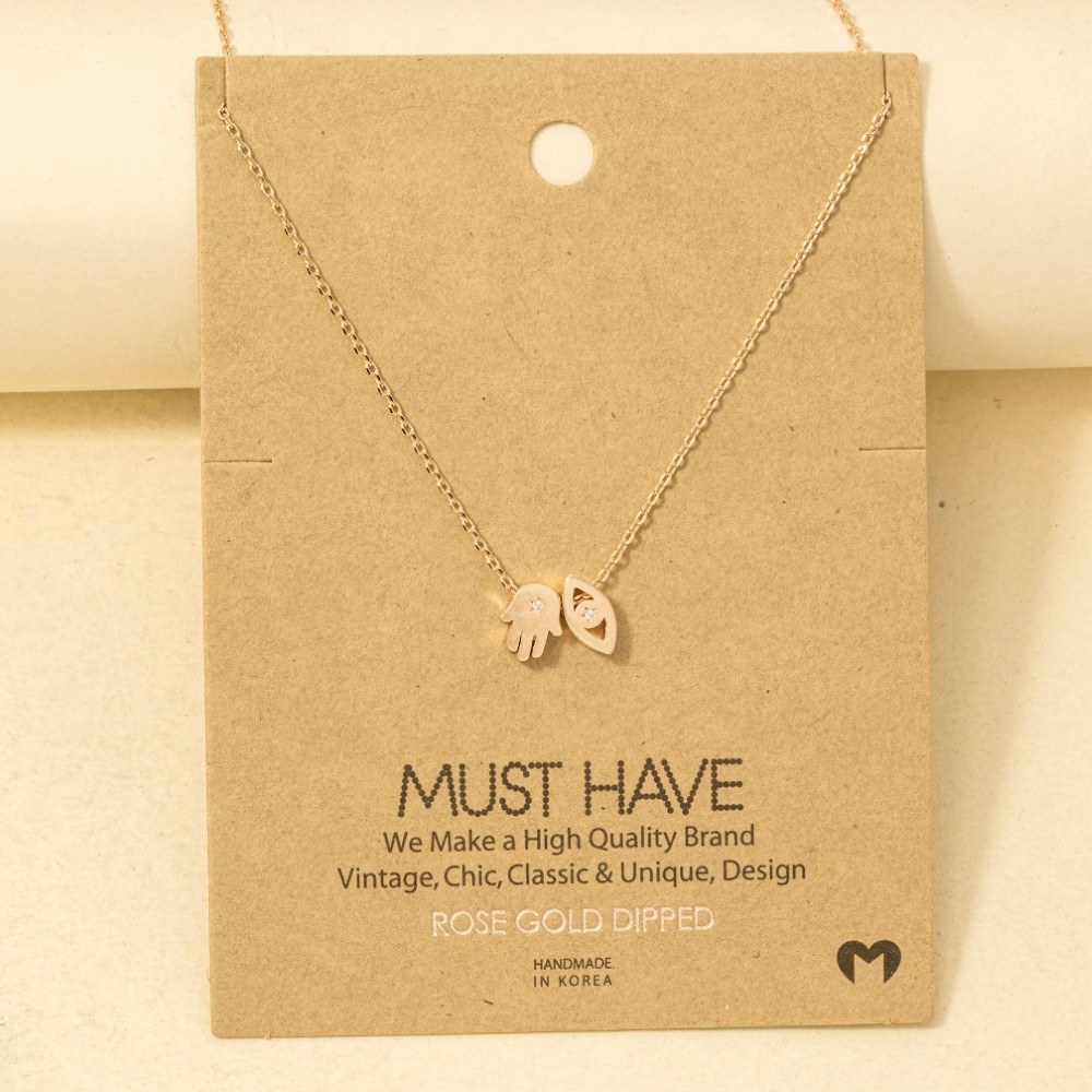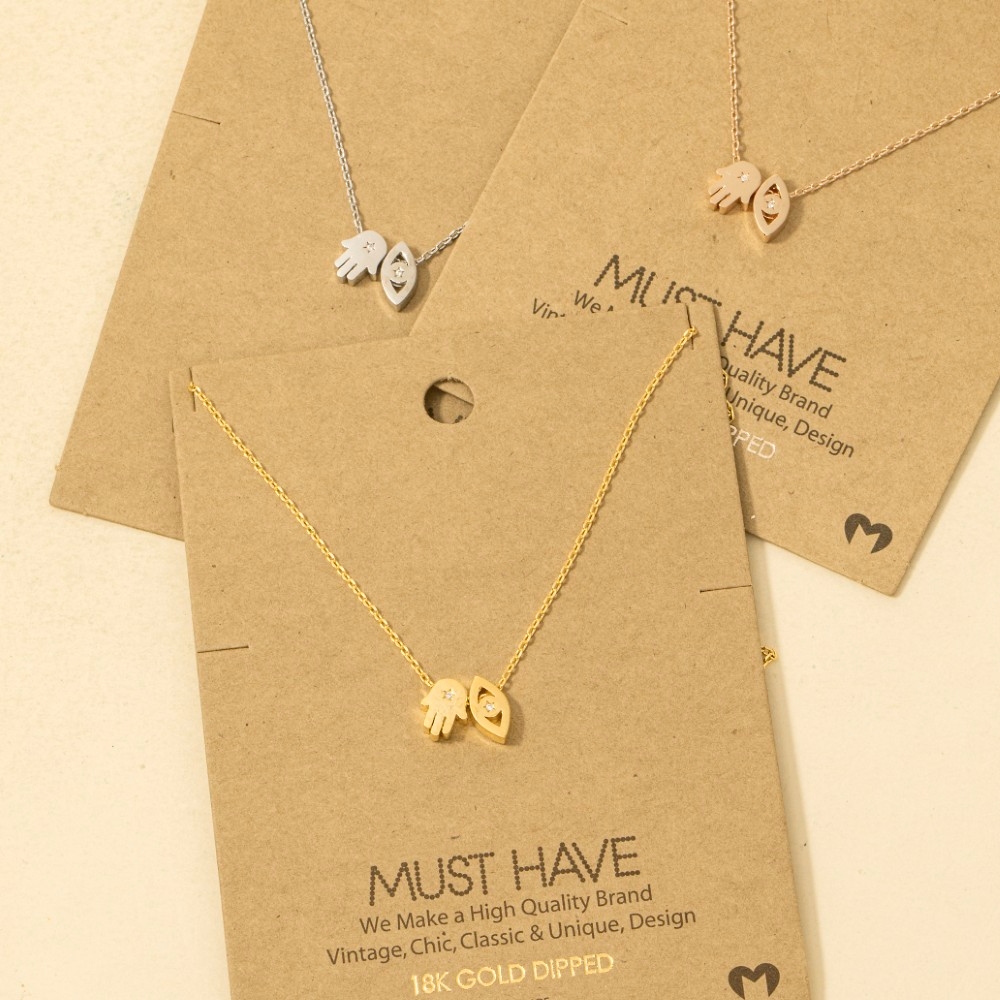 • Sleek and modern, this trending necklace highlights a special gold dipped hamsa hand evil eye pendant necklace design. This trending necklace is the perfect way to add a touch of elegance to any outfit. Available in G, R, S. This item is sold in packs of 1.