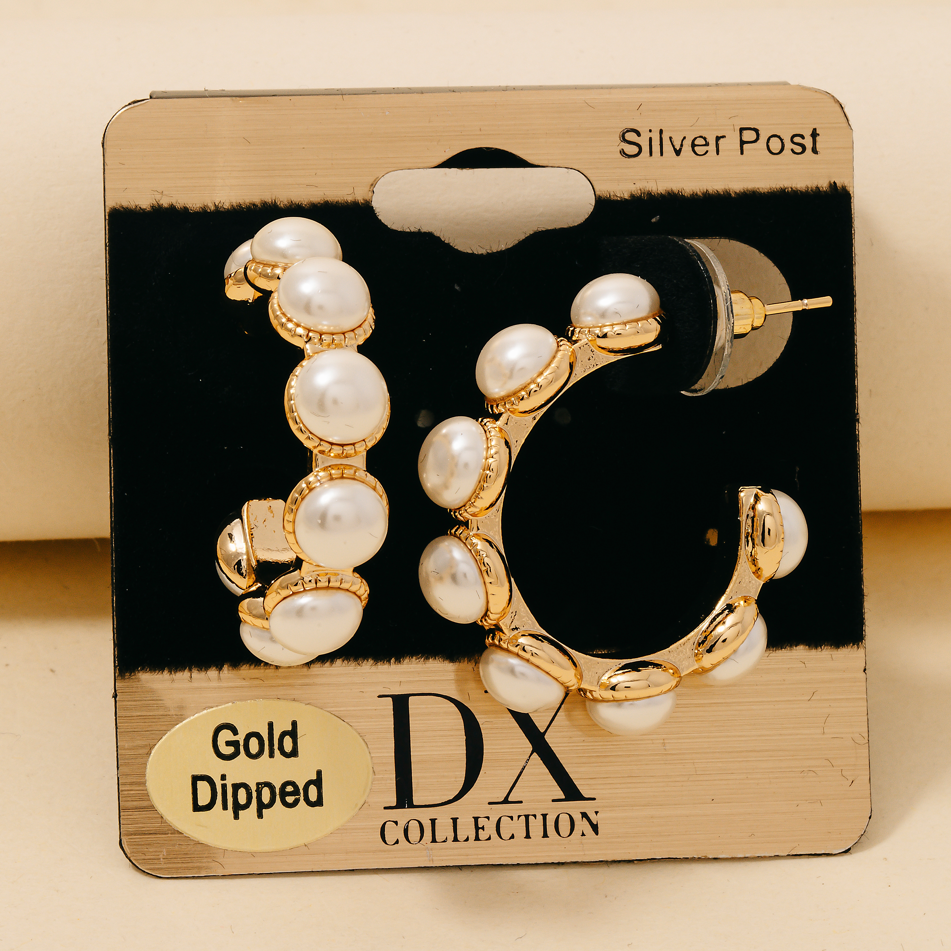 This piece is the epitome of sophistication and elegance, this pair of hoop earrings radiates a sleek gold dipped pearl studded design. Unleash the power of style with this versatile pair of hoop earrings, perfect for enhancing the charm of your wardrobe. Available in G. This item is sold in packs of 12.