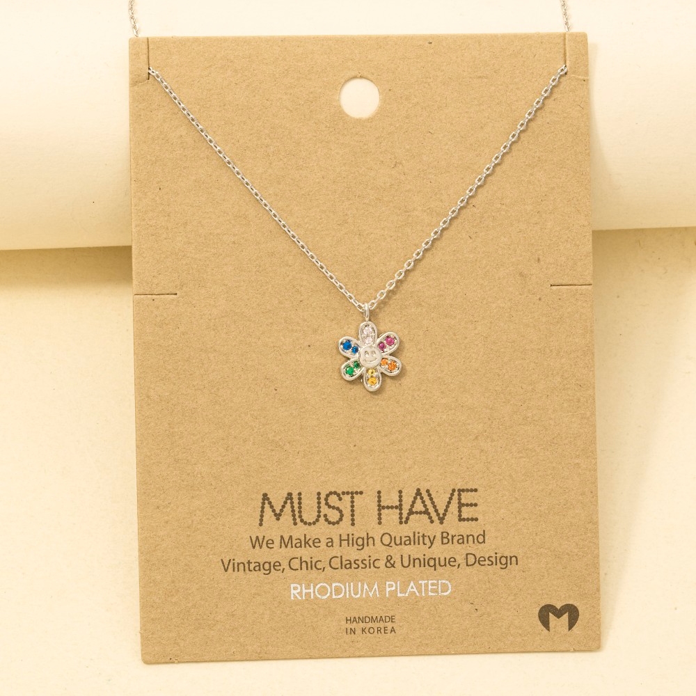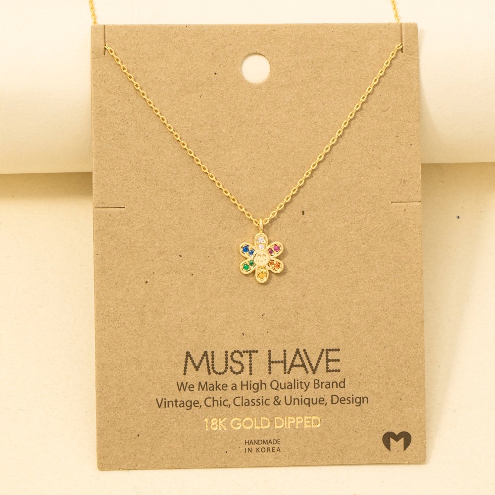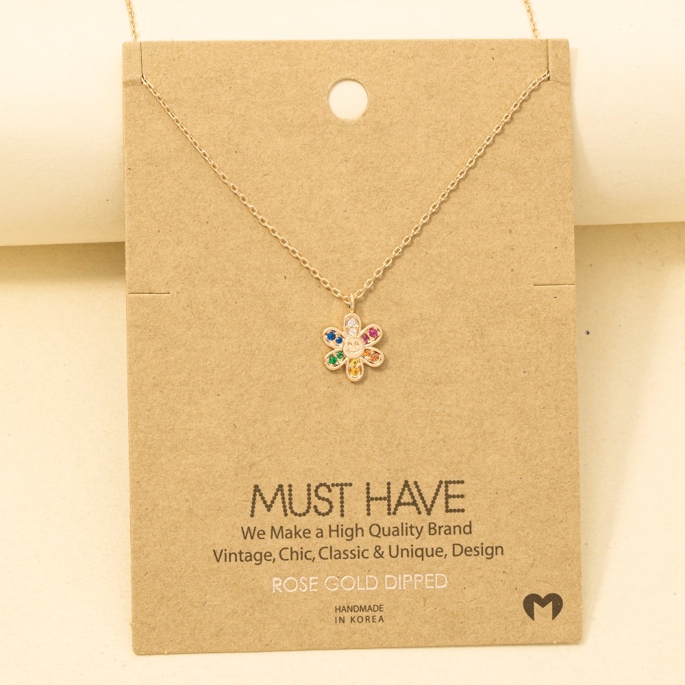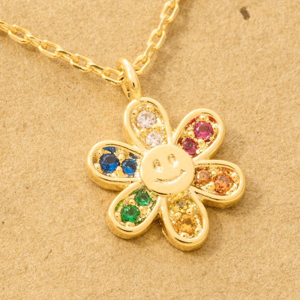 • A unique and stylish piece that sets you apart, this trending necklace boasts a magnificent gold dipped rainbow cubic zirconia smiley face flower pendant necklace design. Unleash the power of style with this versatile trending necklace, perfect for enhancing the charm of your wardrobe. This item is sold in packs of 1.