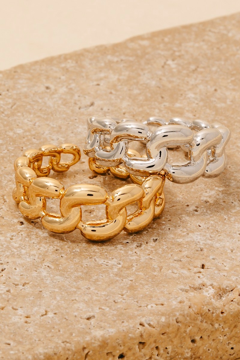 This ring showcases a unique gold dipped solid chain link open band style. Unveil modern elegance with this subtly intricate ring.