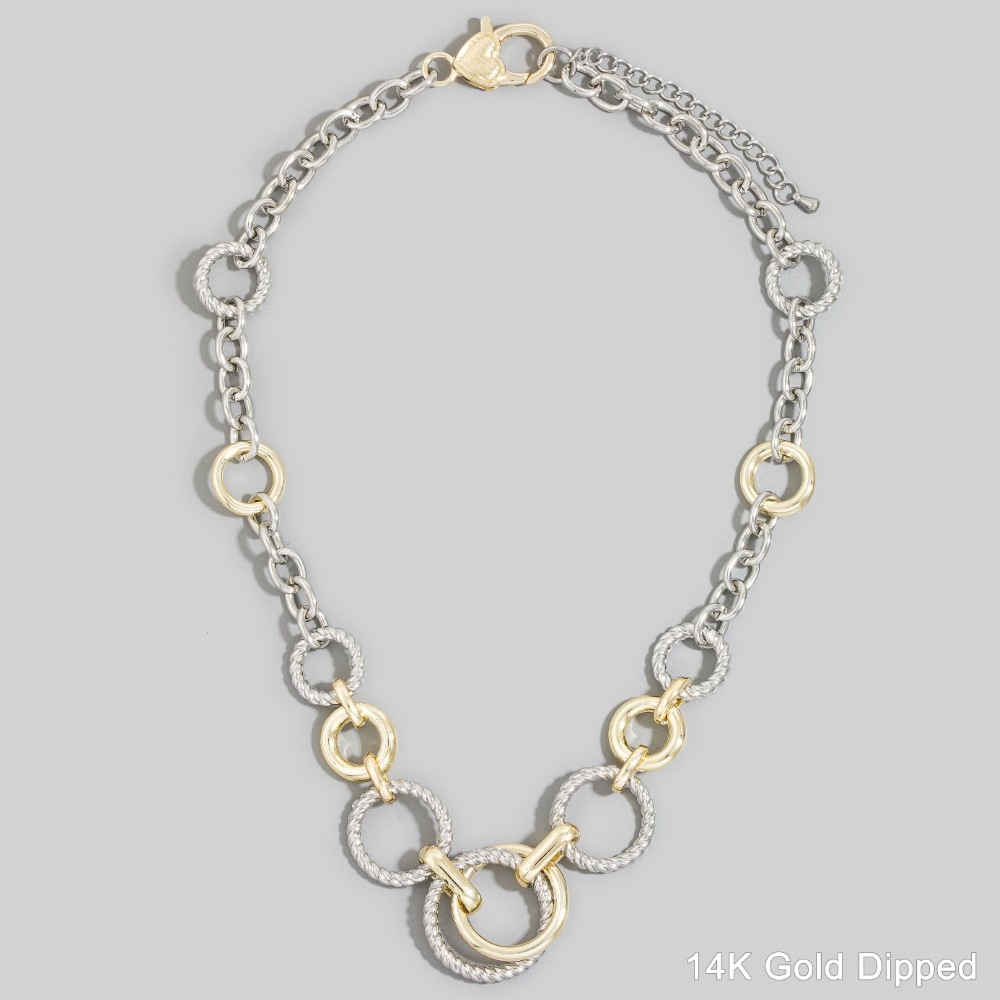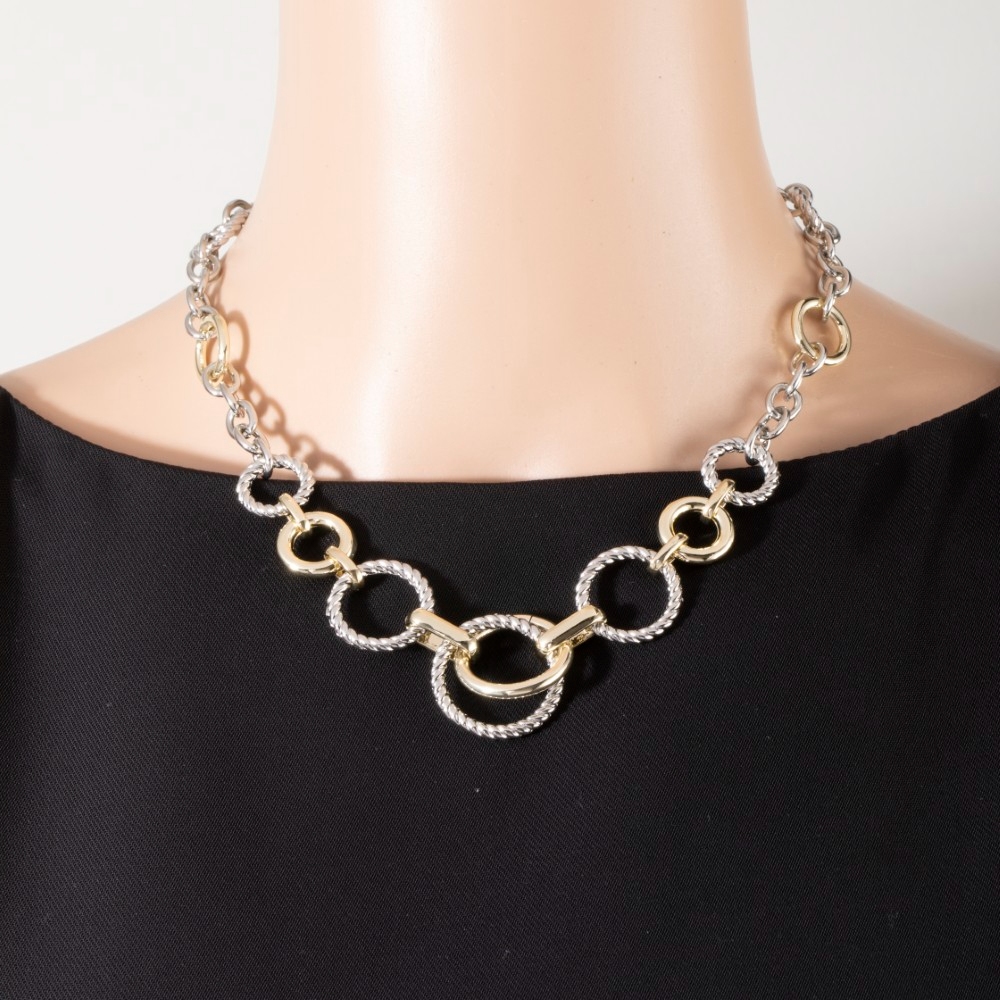 • This season's hottest chain necklace, this chain necklace embodies a sophisticated two-tone rope & circle link design. A must-have chain necklace for anyone who loves to add some flair to their outfits. This item is sold in packs of 1.