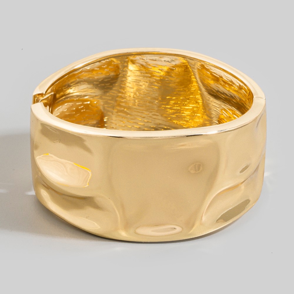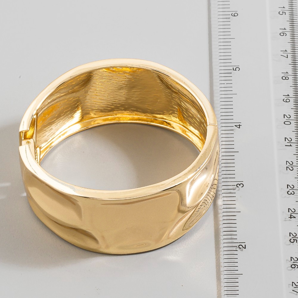 A must-have for any fashion-forward individual, this bangle bracelet flaunts a luxurious gold dipped wide warped hinge design. Elevate your fashion IQ with this versatile bangle bracelet, designed to seamlessly integrate into any style profile. This item is sold in packs of 1.