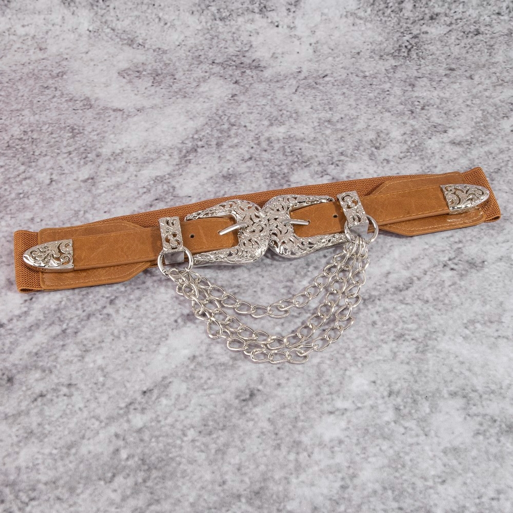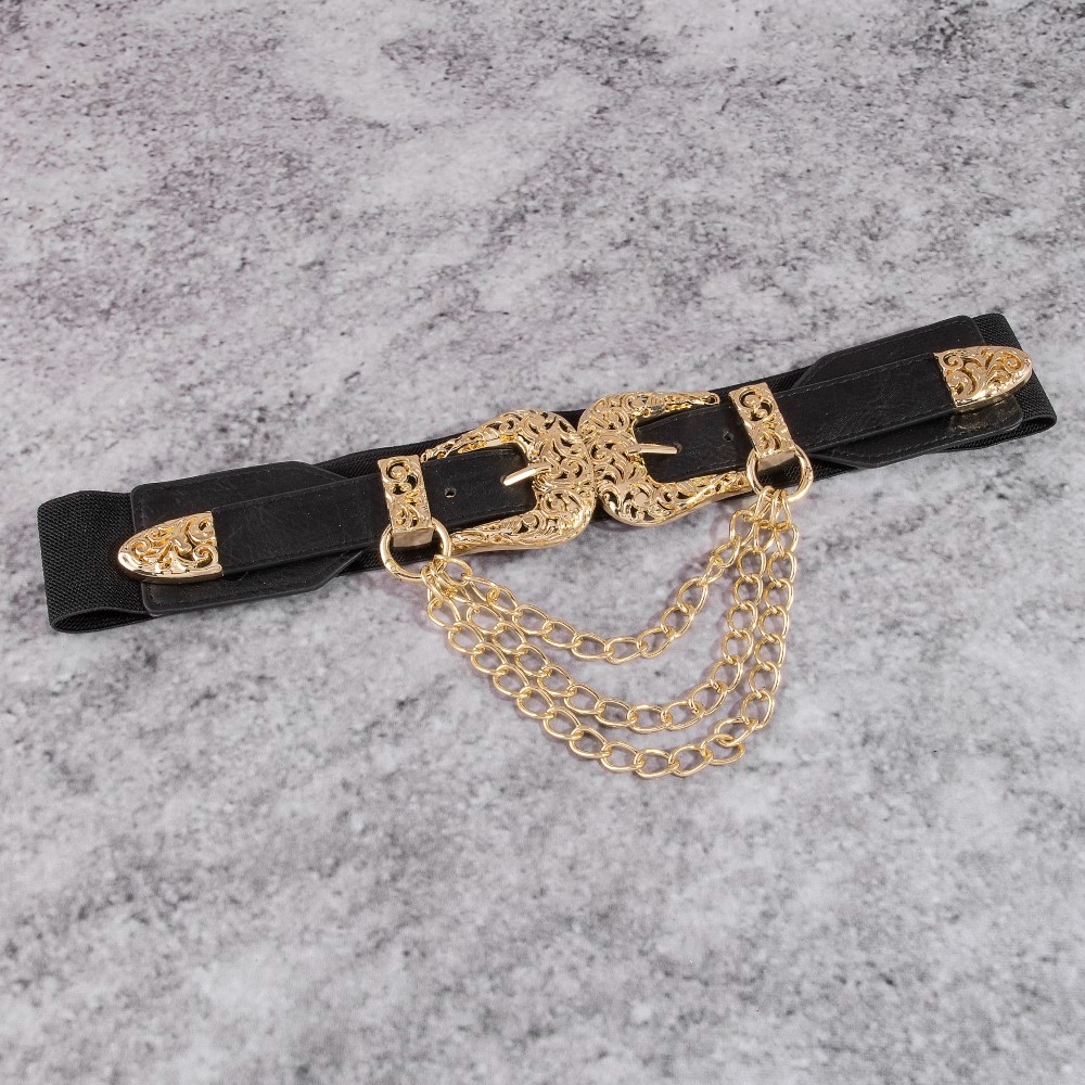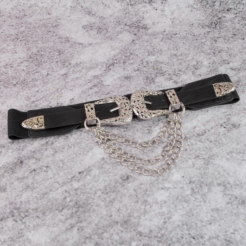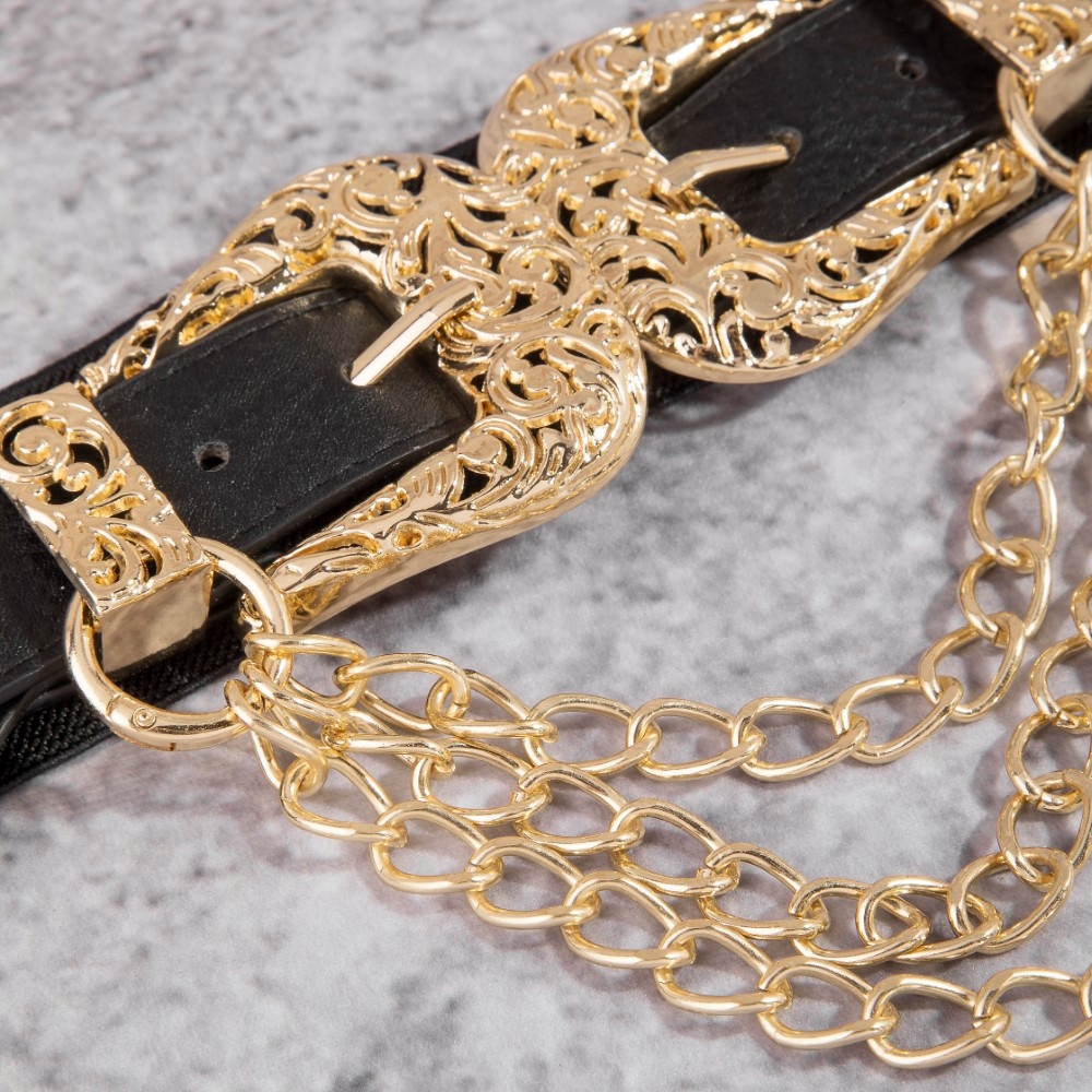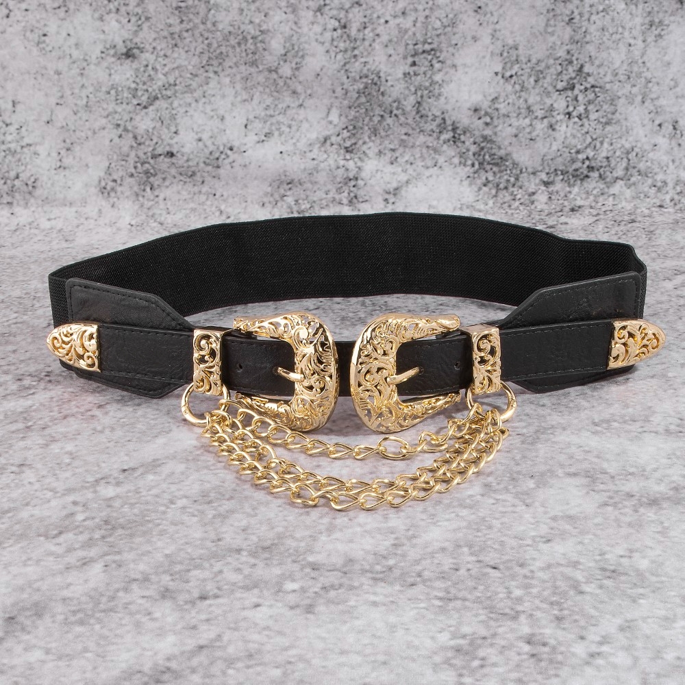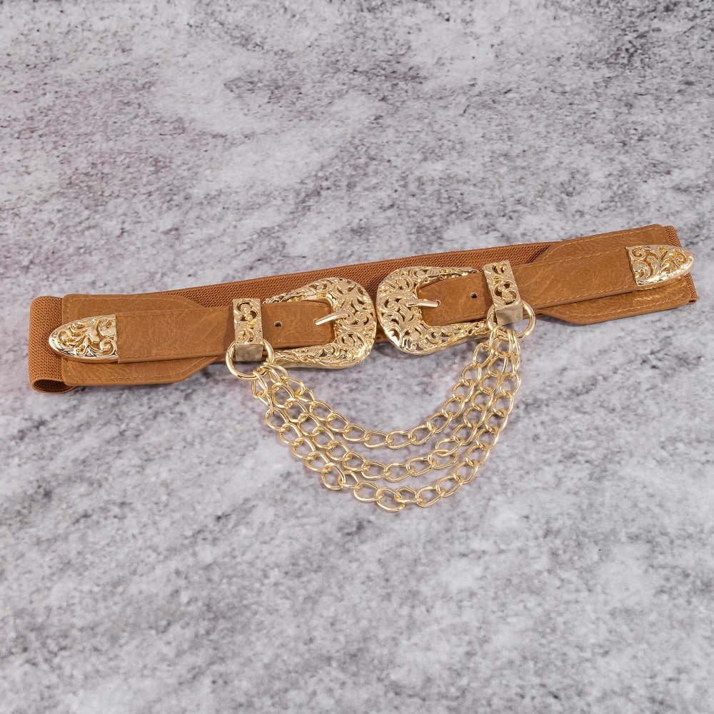 - Perfectly versatile and endlessly stylish, this leather belt radiates a sleek gold double buckle chain detail vegan design. Embrace fashion flexibility with this versatile leather belt, designed to effortlessly enhance the sophistication of any outfit. Available in BG, BRG, BRS, BS. This item is sold in packs of 1.