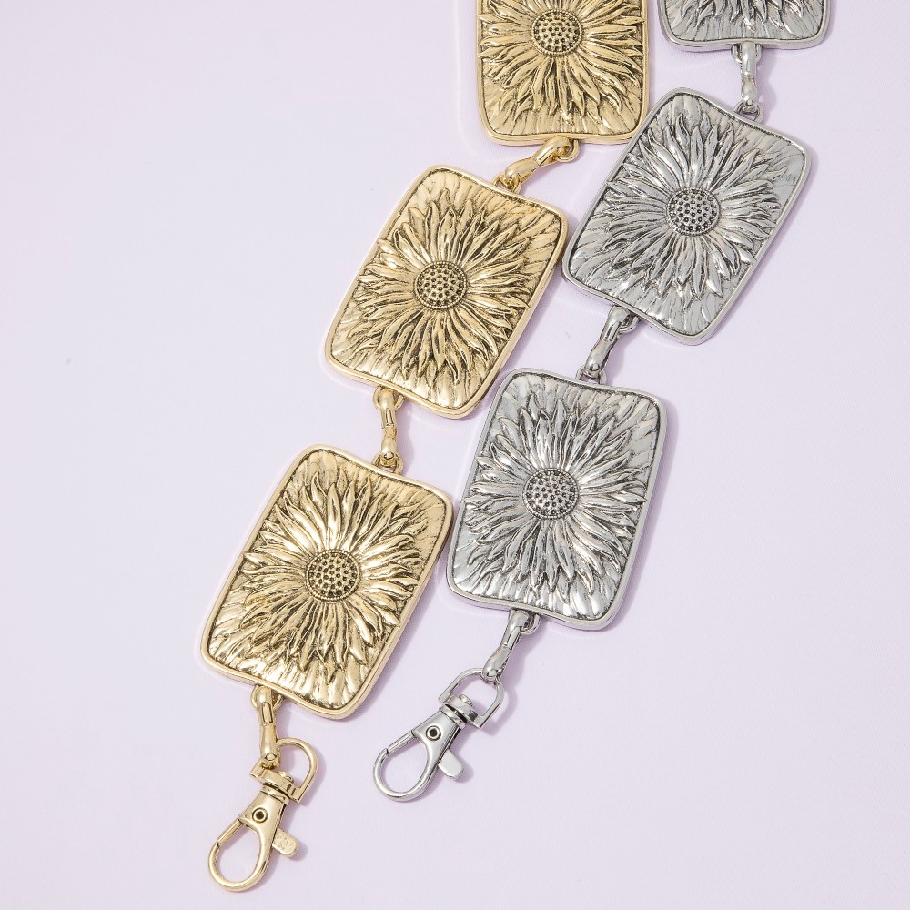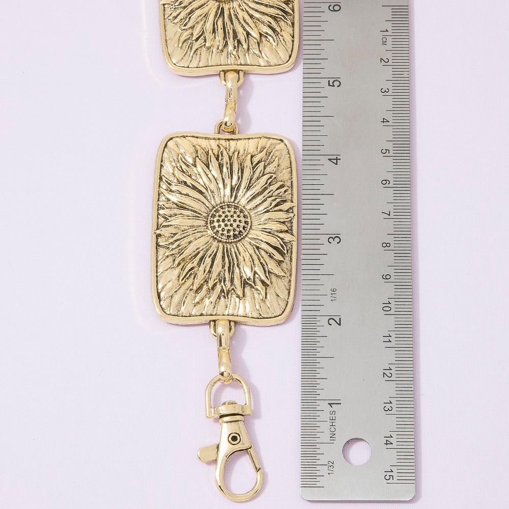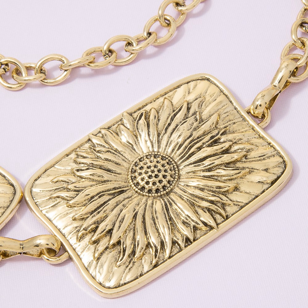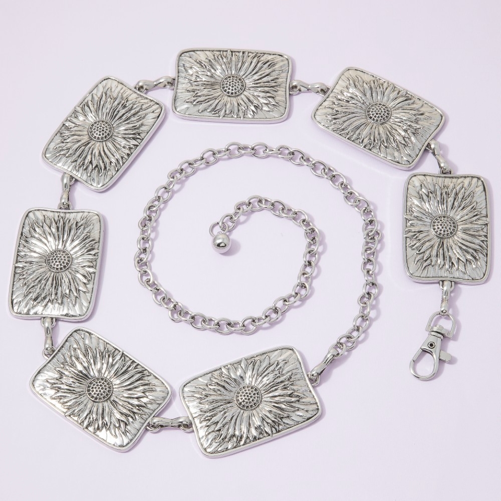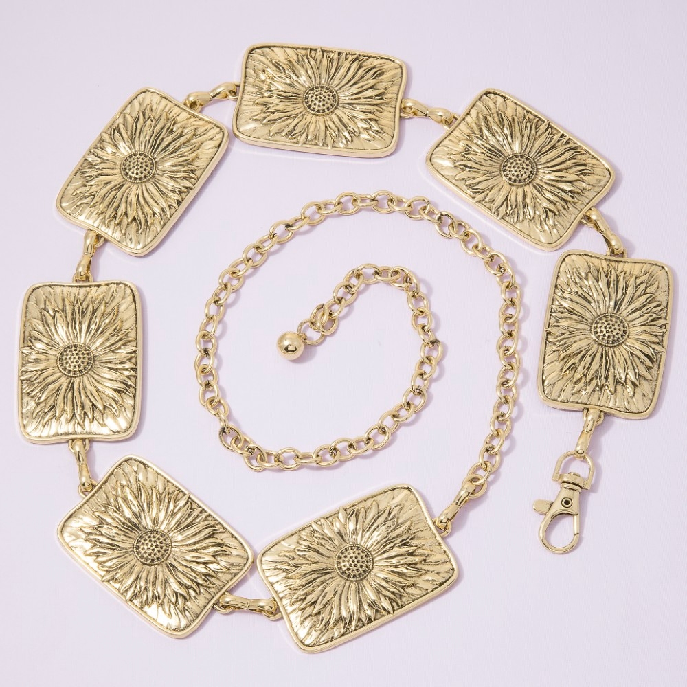 • This piece is both timeless and contemporary, this chain belt displays a unique gold engraved sunflower square medallion link design. Discover a new level of fashion versatility as this chain belt effortlessly elevates the allure of your attire. Available in G, S. This item is sold in packs of 1.
