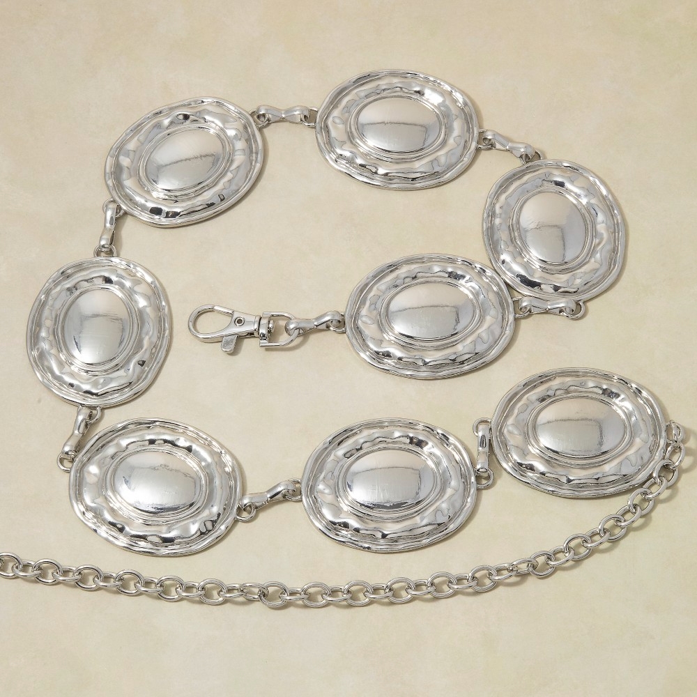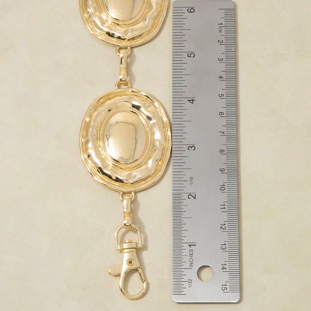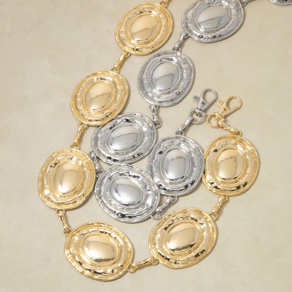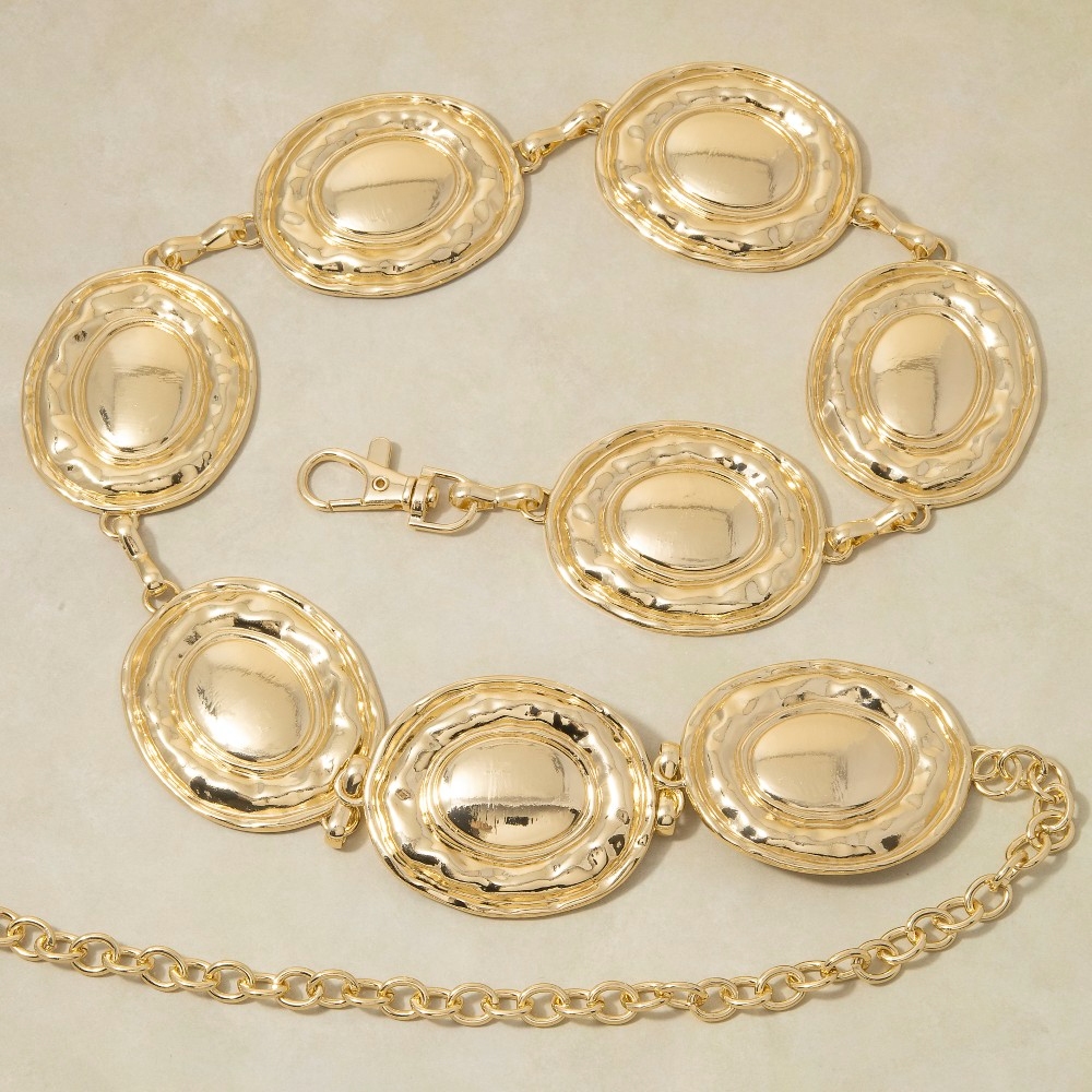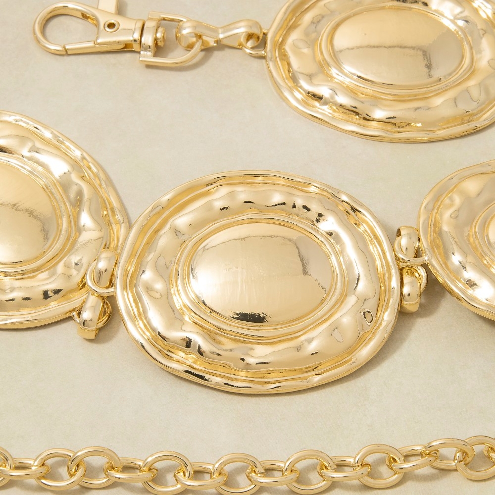 - The epitome of sophistication and style, this chain belt encompasses a grand gold hammered dome oval medallion link design. A stylish chain belt that's perfect for complementing your favorite outfit. Available in G, S. This item is sold in packs of 1.