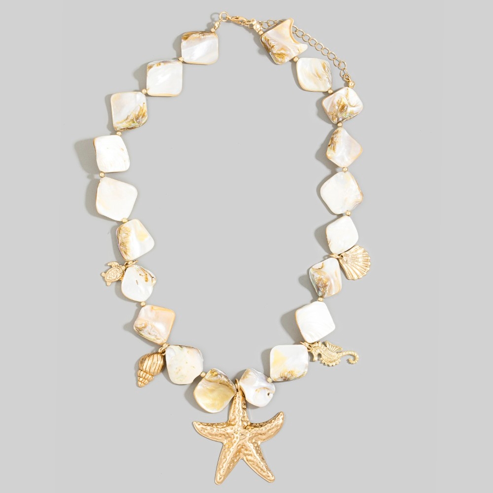 • Bold, daring, and endlessly stylish, this necklace emanates an elegant gold starfish & coastal charms shell stone design. A must-have necklace that effortlessly enhances your style, no matter the occasion. Available in GDNAT. This item is sold in packs of 1.