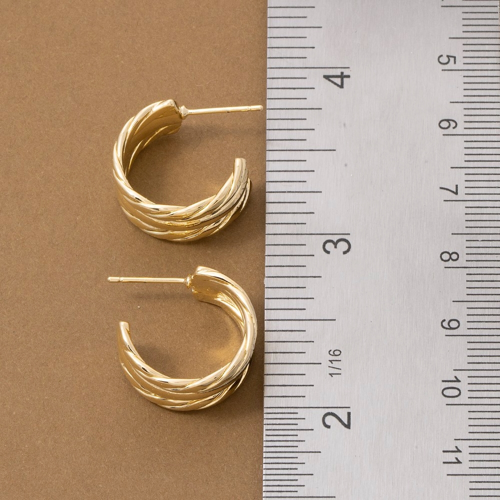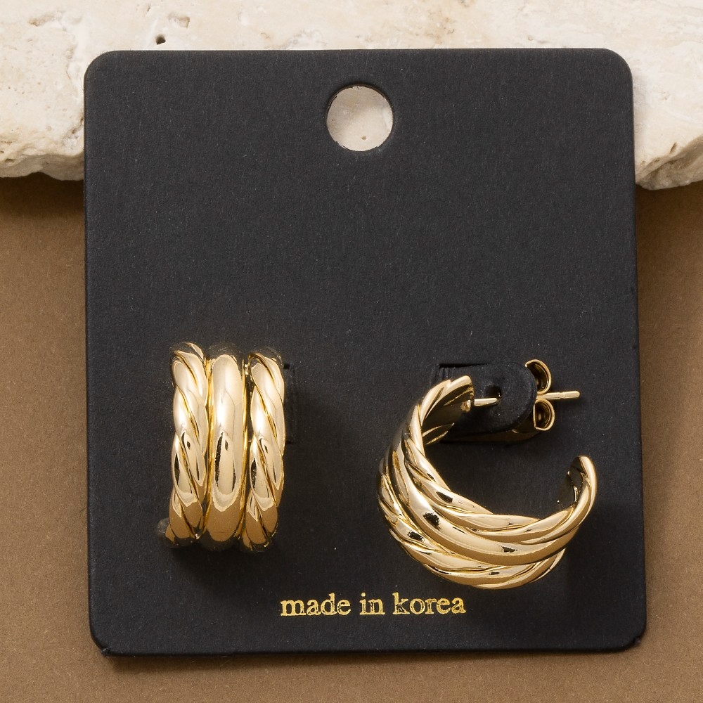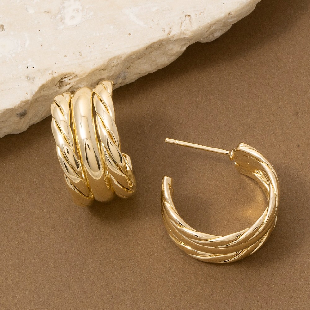 Add a touch of luxury to any outfit, this pair of hoop earrings highlights a special gold triple twisted rope design. Upgrade your fashion game with this versatile pair of hoop earrings, a timeless addition that complements any outfit seamlessly. This item is sold in packs of 12.
