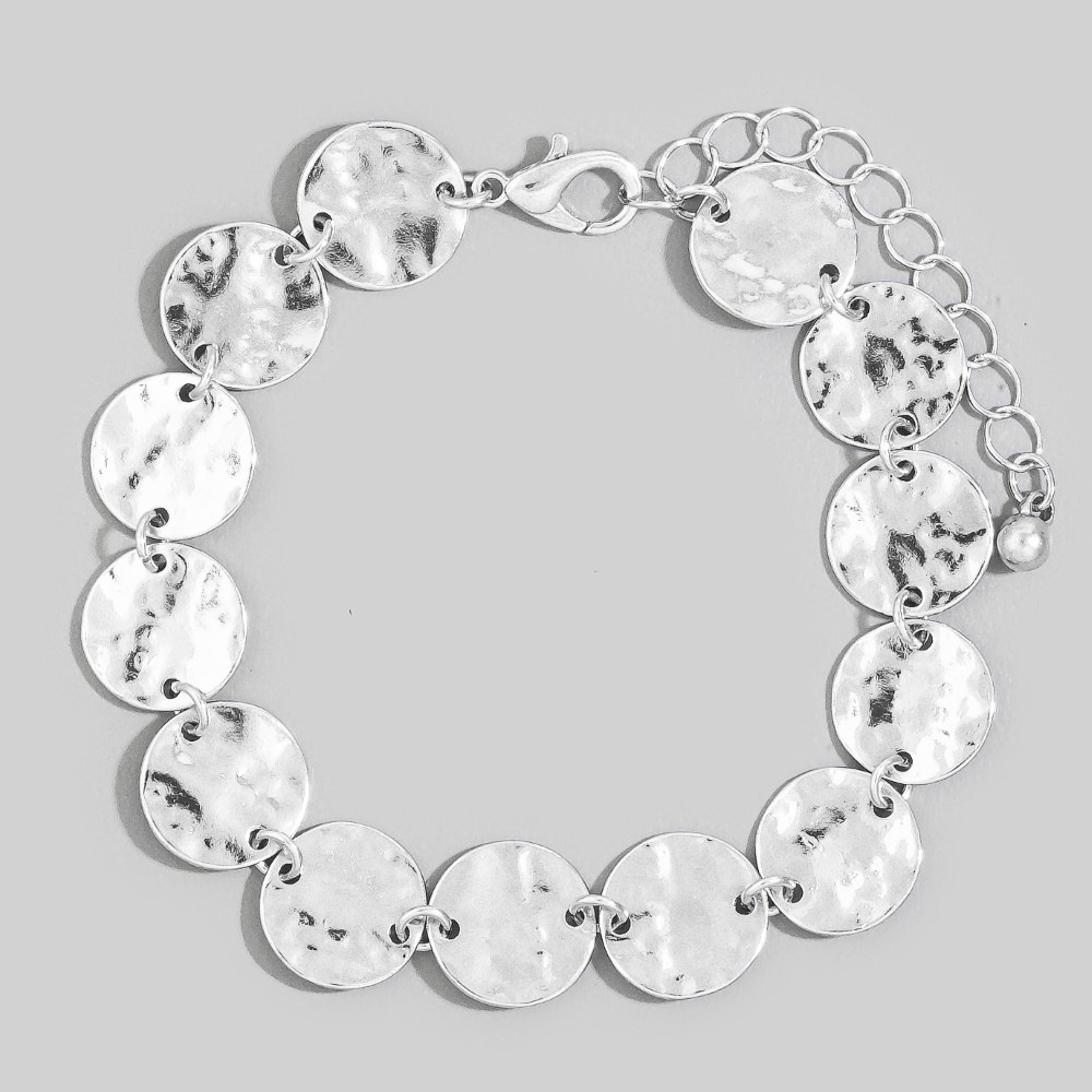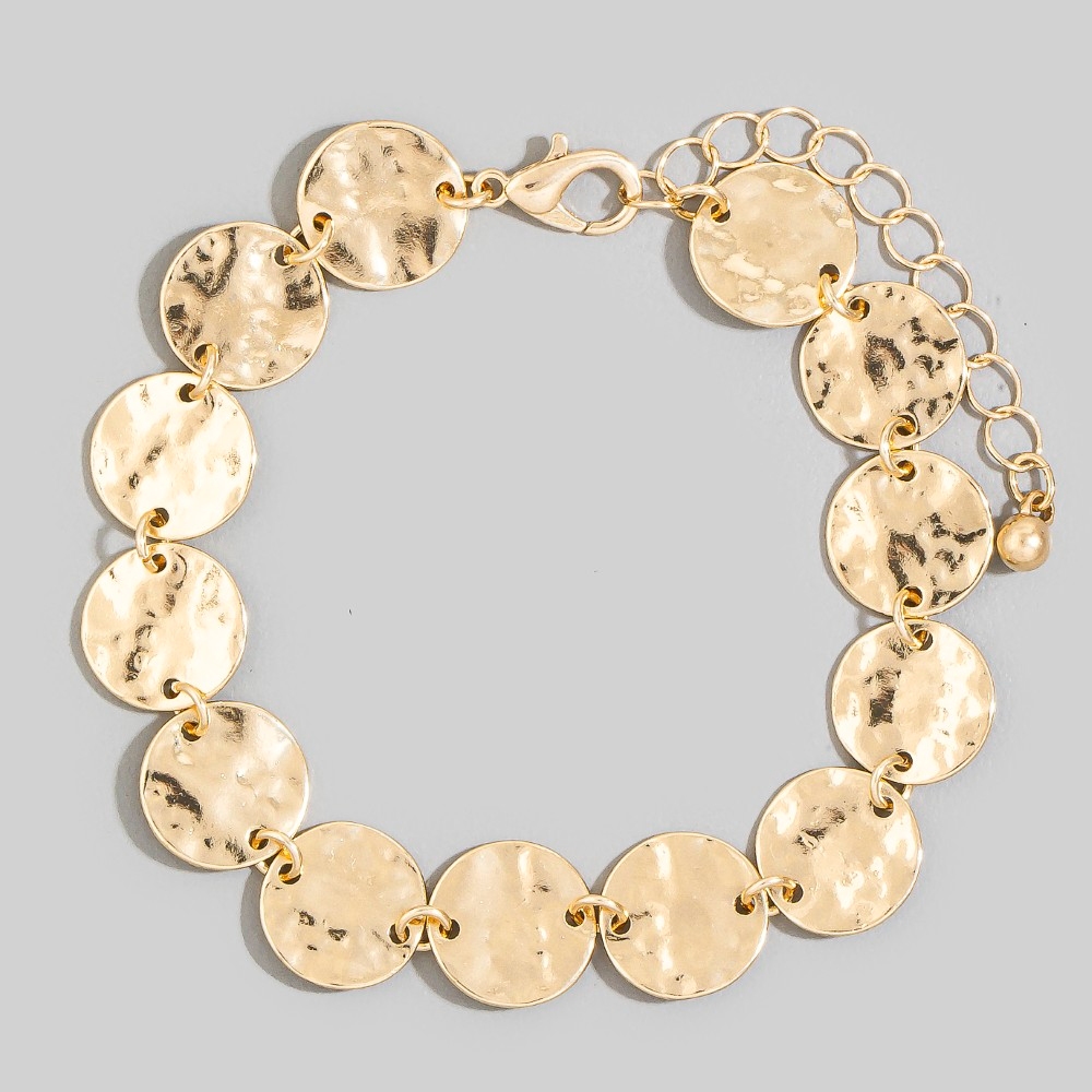 • This piece is both timeless and on-trend, this bracelet showcases a breathtaking hammered gold coin link design. This item is ideal for those who want to add some personality to their outfits without being too bold. Available in GD, GDSIL, SIL. This item is sold in packs of 1.
