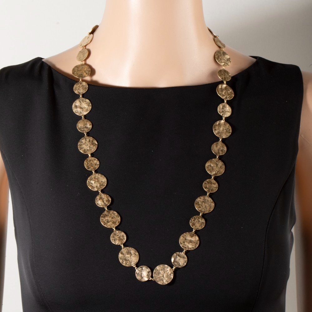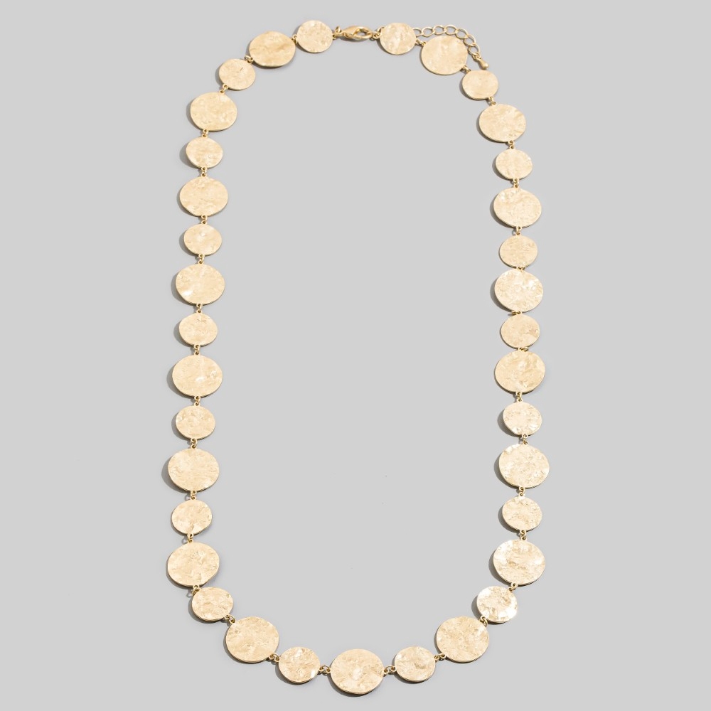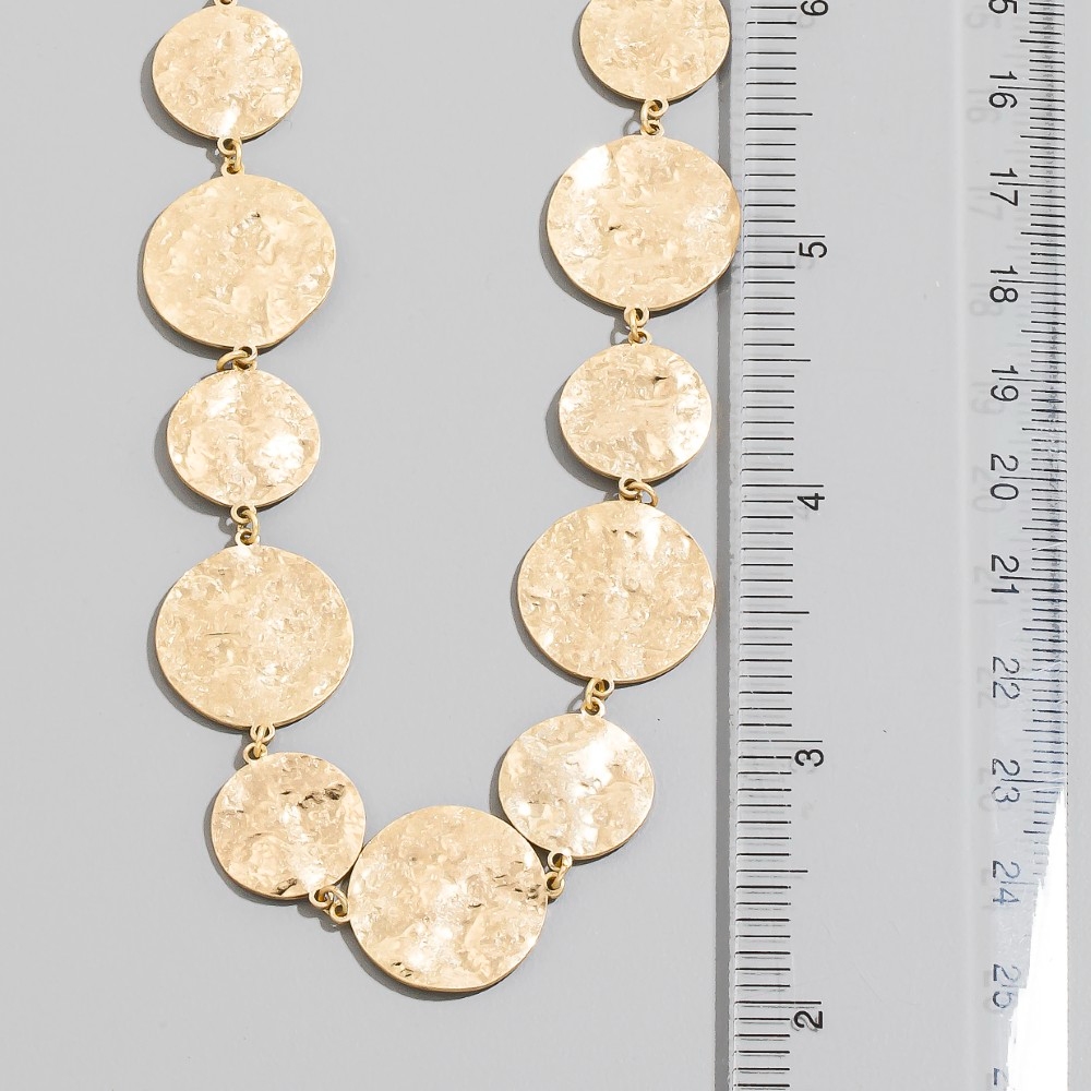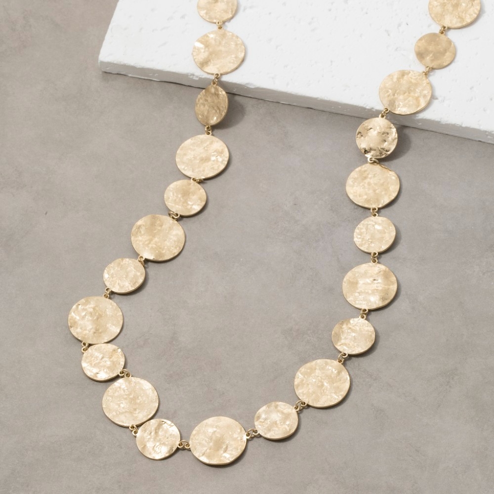 - Effortlessly chic and sophisticated, this chain necklace highlights a special hammered gold disc design. A must-have chain necklace that adds a unique flair to any look. Available in WG. This item is sold in packs of 1.