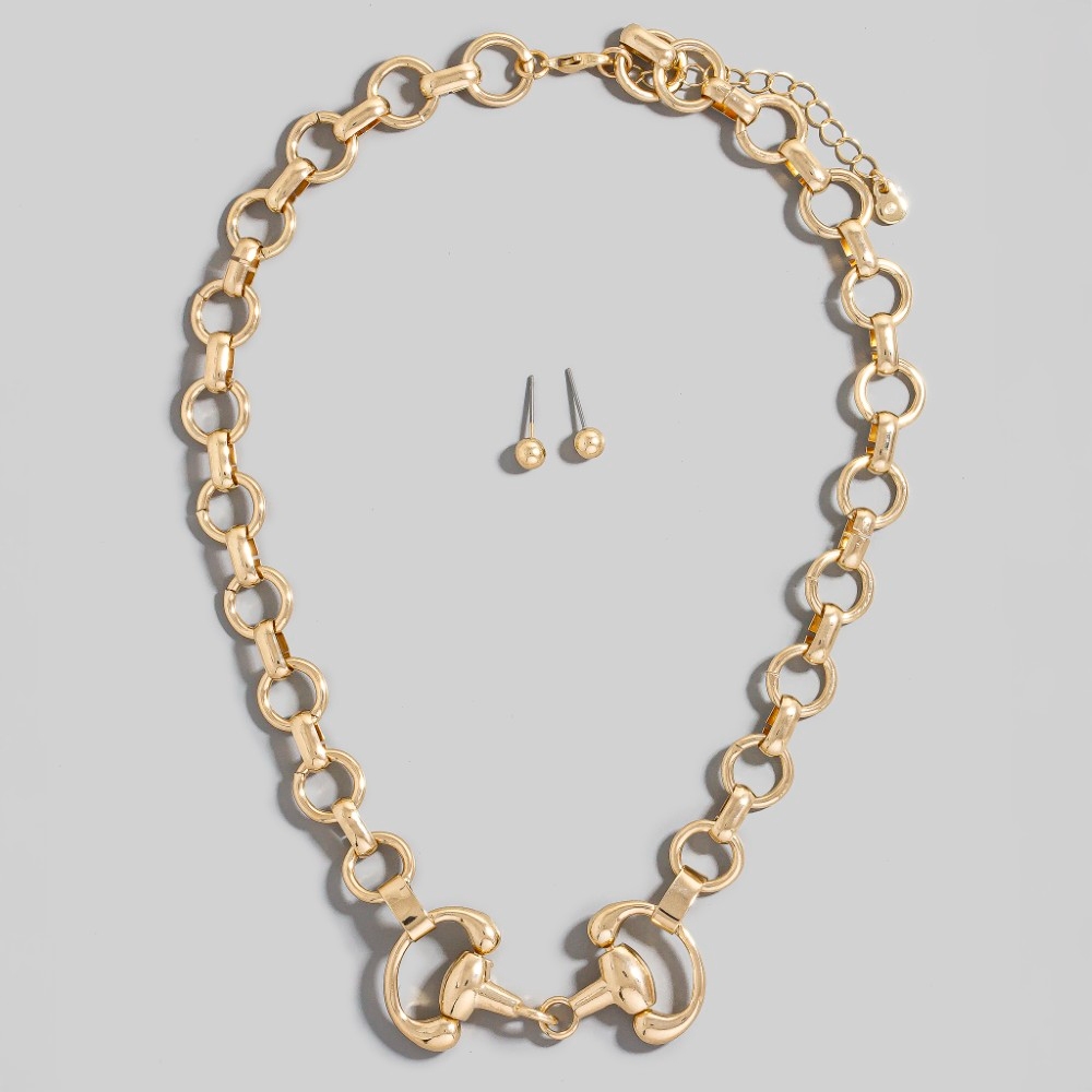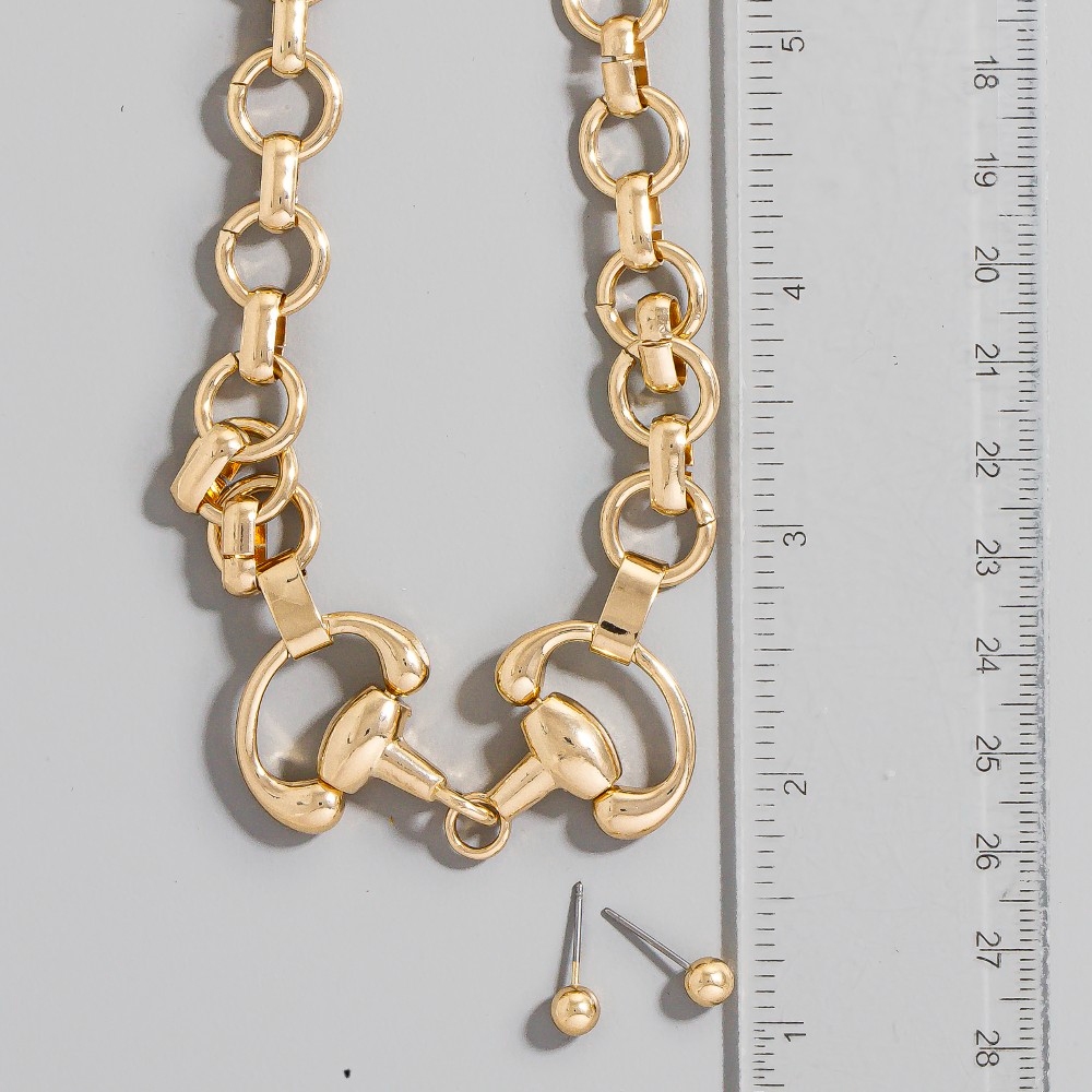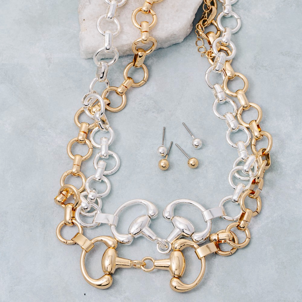 Bold and daring, this necklace set embodies a sophisticated horsebit chain link design. The perfect way to elevate any outfit, this necklace set adds a touch of elegance and style. Available in GD and SV. This item is sold in packs of 1.