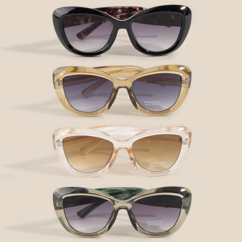 Elevate any look, this set of sunglasses reveals an intricate large cat eye sunglasses set design. Perfect for adding some personality and flair to your wardrobe, this set of sunglasses is a must-have. Available in ASSORTED. This item is sold in packs of 12.