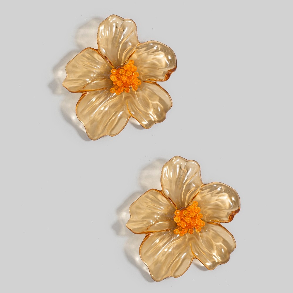 This piece is both elegant and versatile, this pair of stud earrings emanates an elegant large resin flower design. A must-have pair of stud earrings for anyone who loves to add some flair to their outfits. Available in MK. This item is sold in packs of 1.