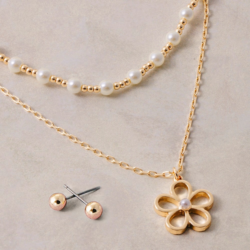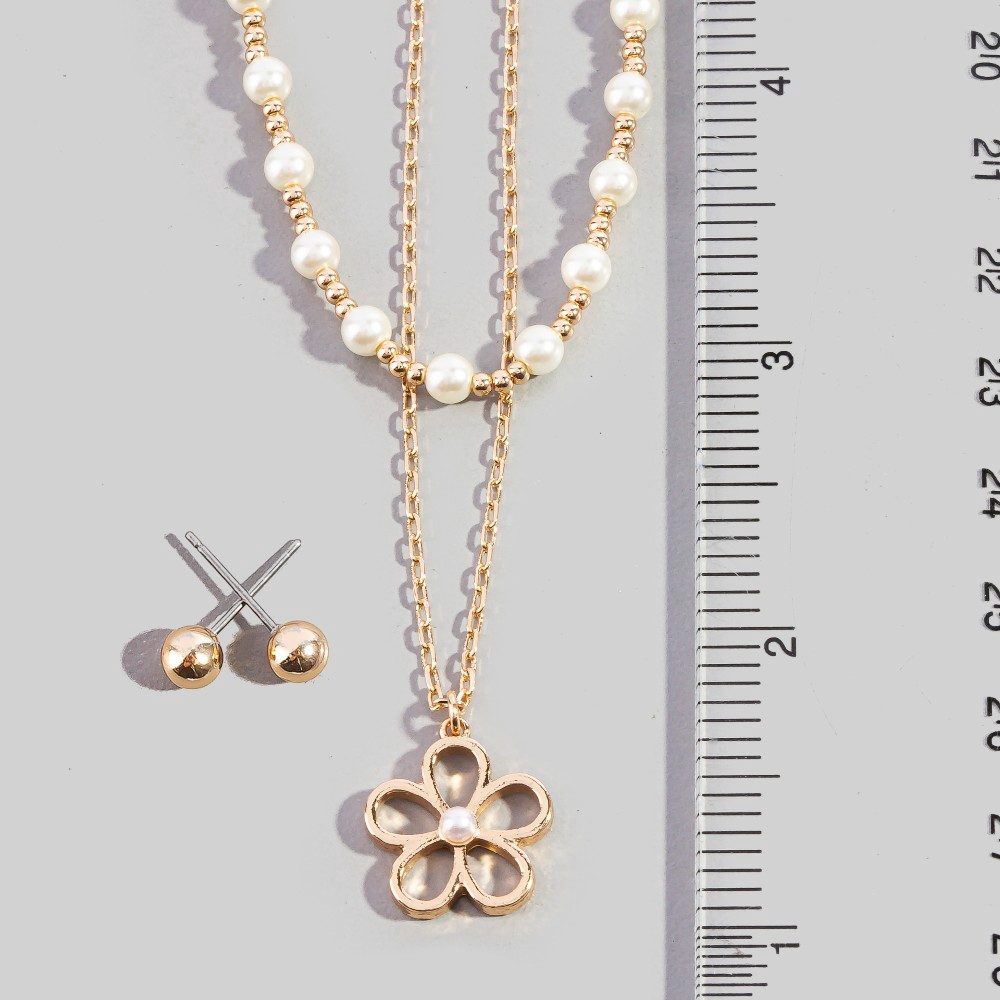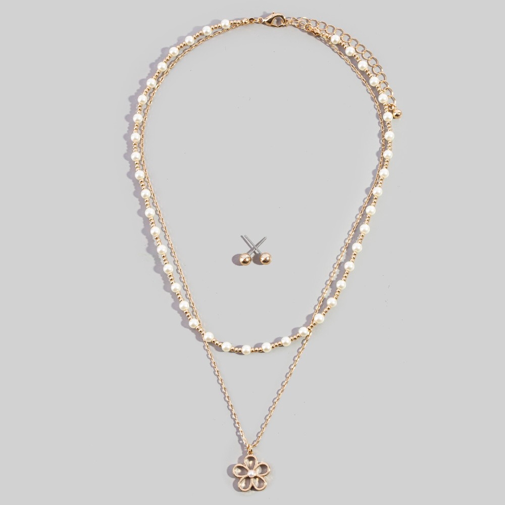 A versatile and stylish addition to any wardrobe, this necklace set adds a distinctive layered pearl bead chain flower pendant design. Redefine your fashion identity with this versatile necklace set, a timeless piece that complements any wardrobe. Available in CRMGD. This item is sold in packs of 1.