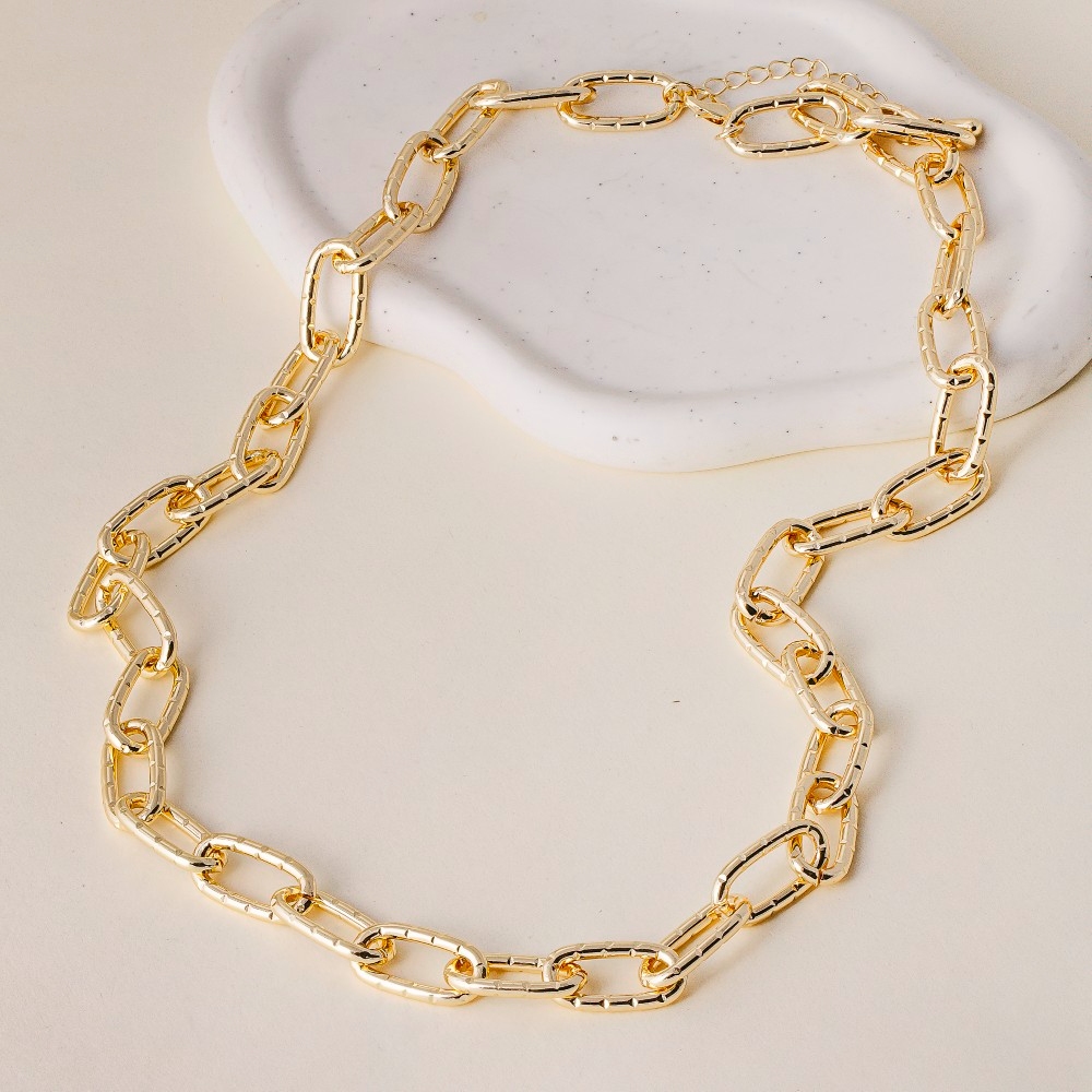 This piece is designed to be both stylish and functional, this chain necklace radiates a sleek long textured oval link design. Perfect for adding some texture and dimension to any outfit, this chain necklace is a must-have. Available in G. This item is sold in packs of 1.