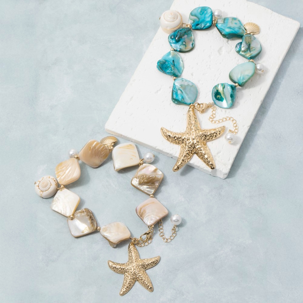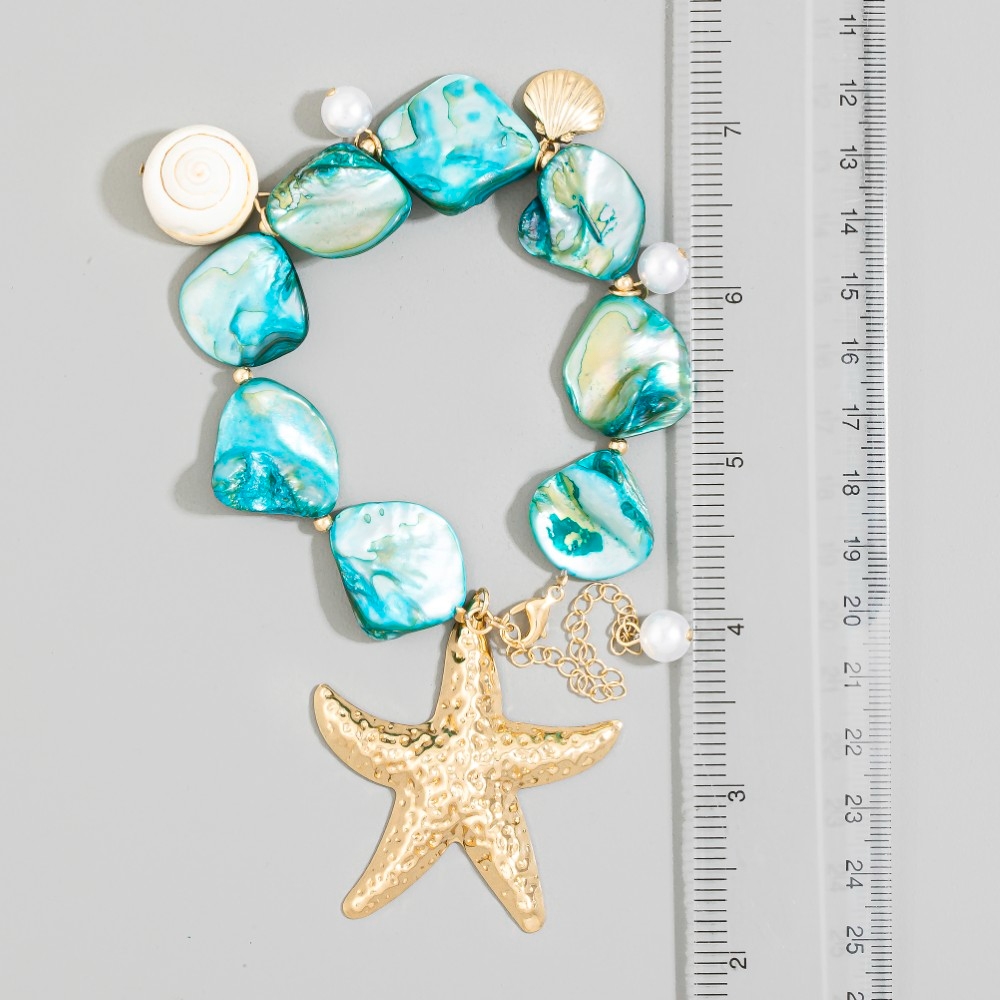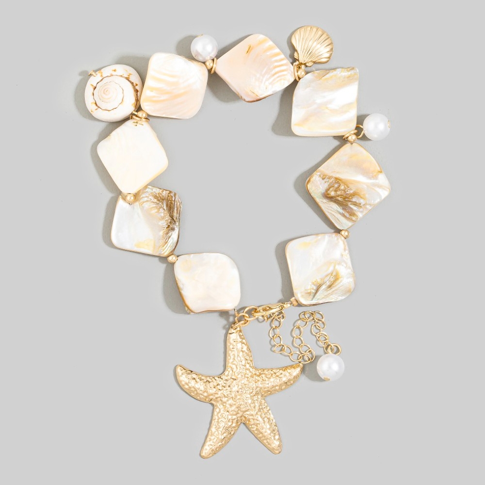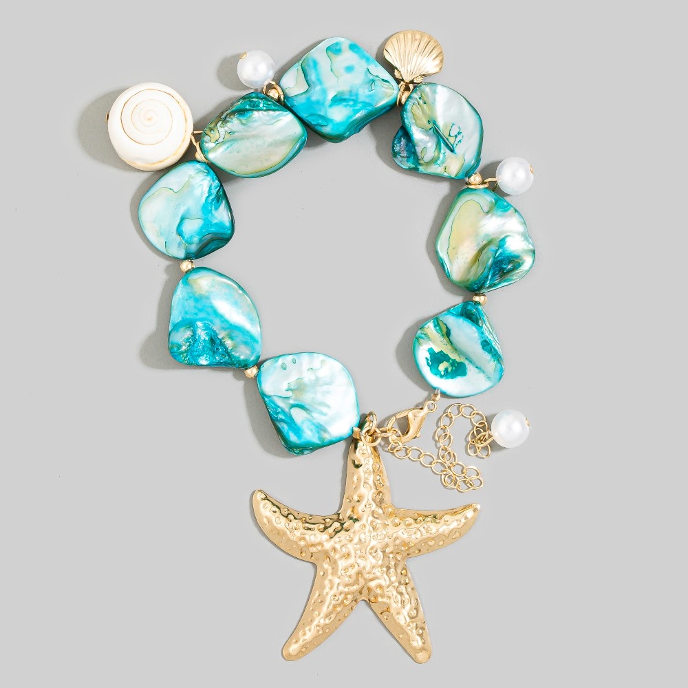 • Stay on-trend and stand out from the crowd, this bracelet presents a striking marbled shell statement with starfish pendant & sea charms design. Elevate your personal style effortlessly with this versatile bracelet, an essential component for a refined wardrobe. Available in GDBL, GDNAT. This item is sold in packs of 1.