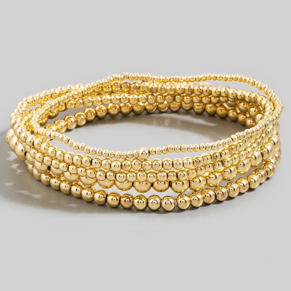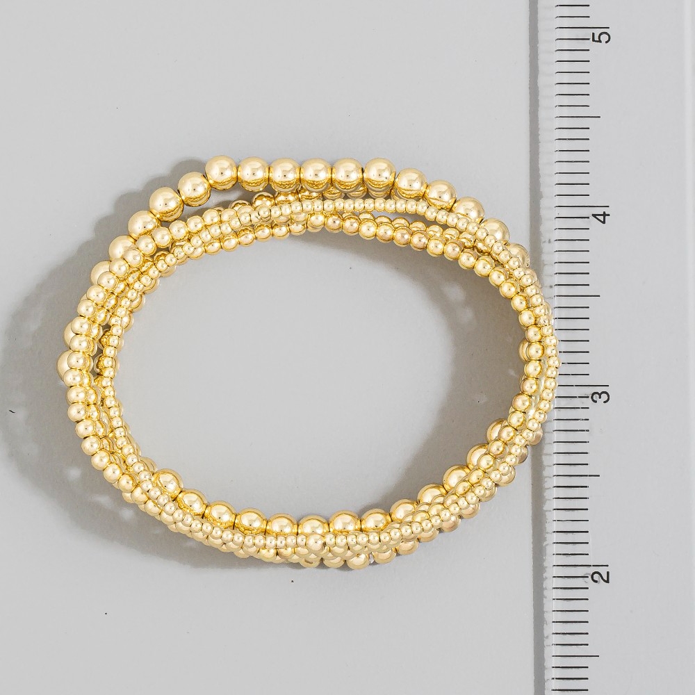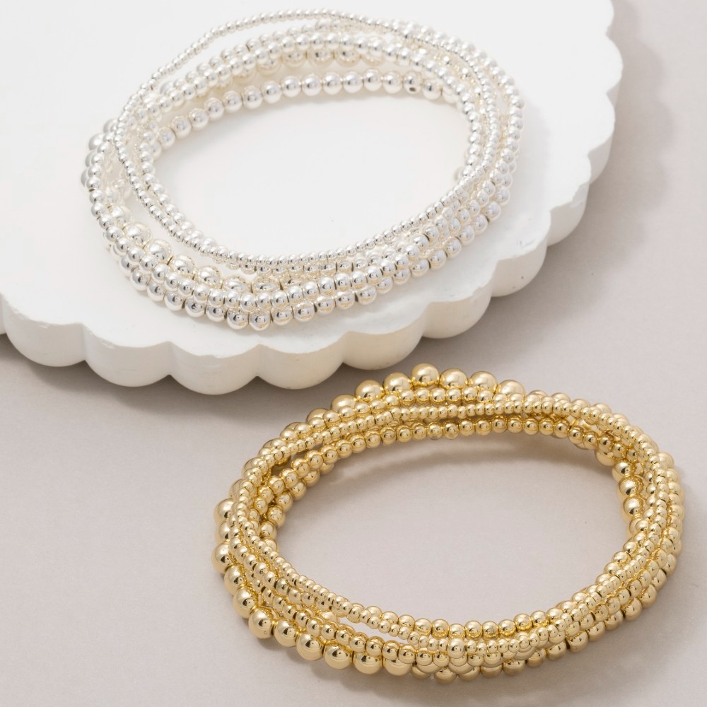 The perfect way to add some sparkle to your outfit, this bracelet offers a remarkable metallic beaded elastic set design. Add some personality to your outfit with this stylish bracelet. Available in G, S. This item is sold in packs of 1.
