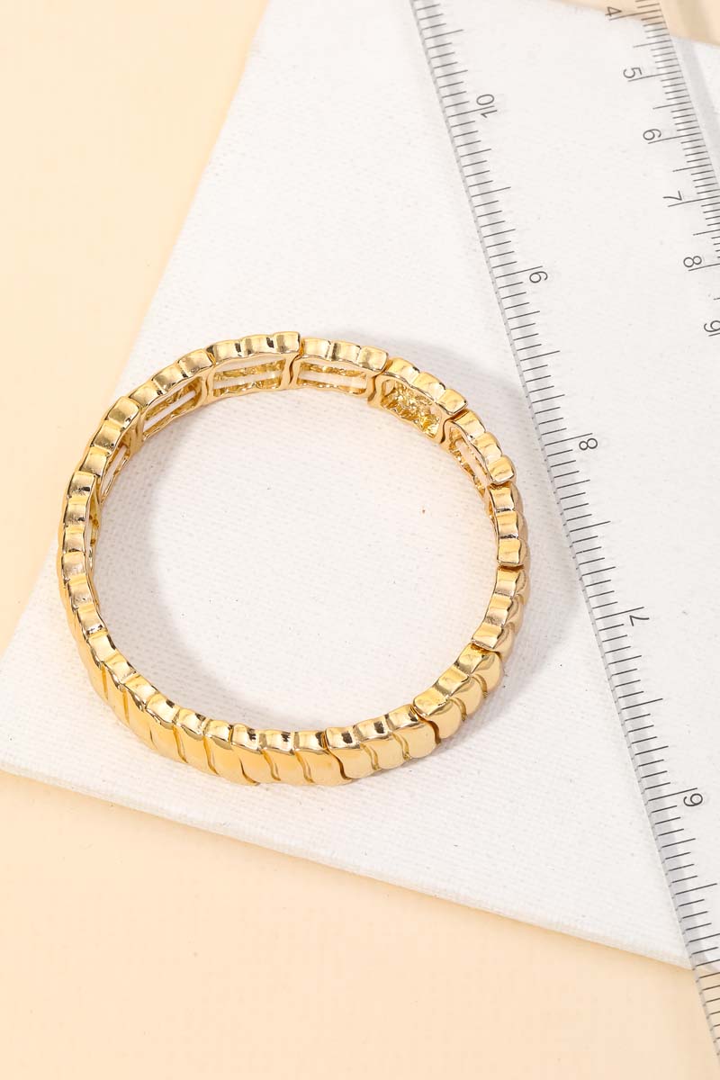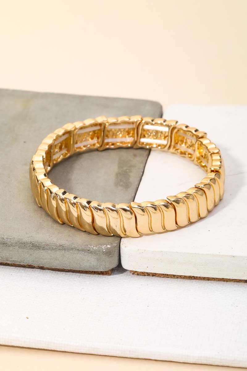 This must have trending stretch bracelet made into a metallic ribbed stretch bracelet design. Perfect for formal events! Available in G and S.