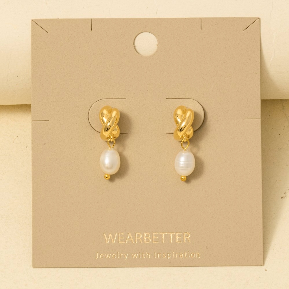 This pair of drop earrings is made with 60% Brass and 40% Acrylic Pearl.