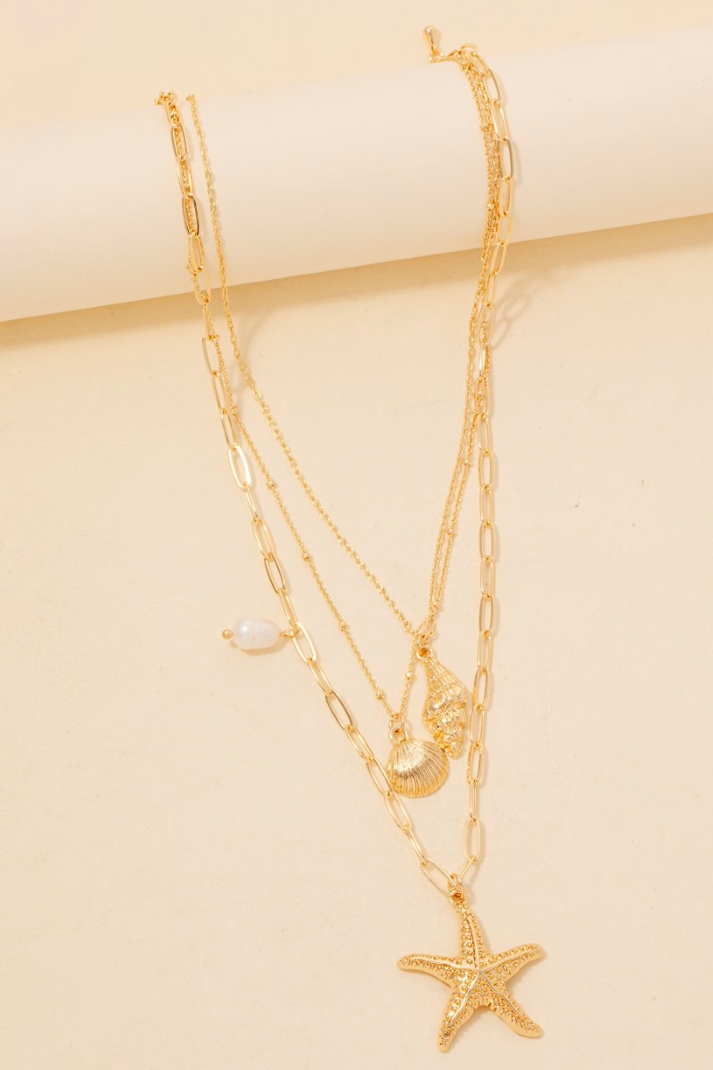 - Bold and daring, this chain necklace possesses a fine mixed sea shells and pearl charms layered design. Elevate your fashion ensemble effortlessly with this versatile chain necklace, a stylish choice for the modern trendsetter. Available in GDCRM. This item is sold in packs of 1.
