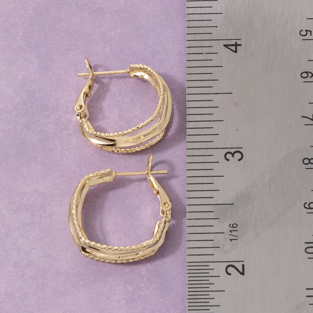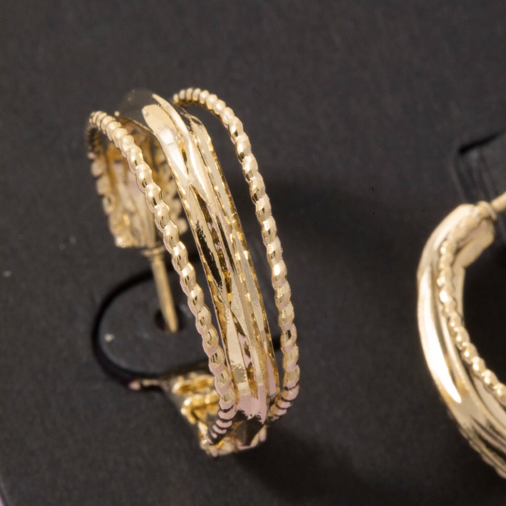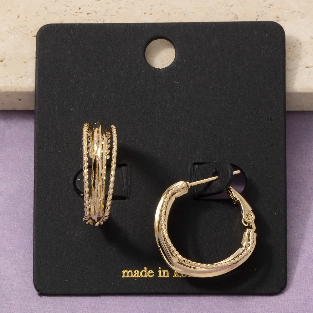 • Stay on-trend and ahead of the fashion curve, this pair of hoop earrings includes a stunning multi-band twisted huggie design. Elevate your fashion ensemble effortlessly with this versatile pair of hoop earrings, a stylish choice for the modern trendsetter. Available in G. This item is sold in packs of 1.