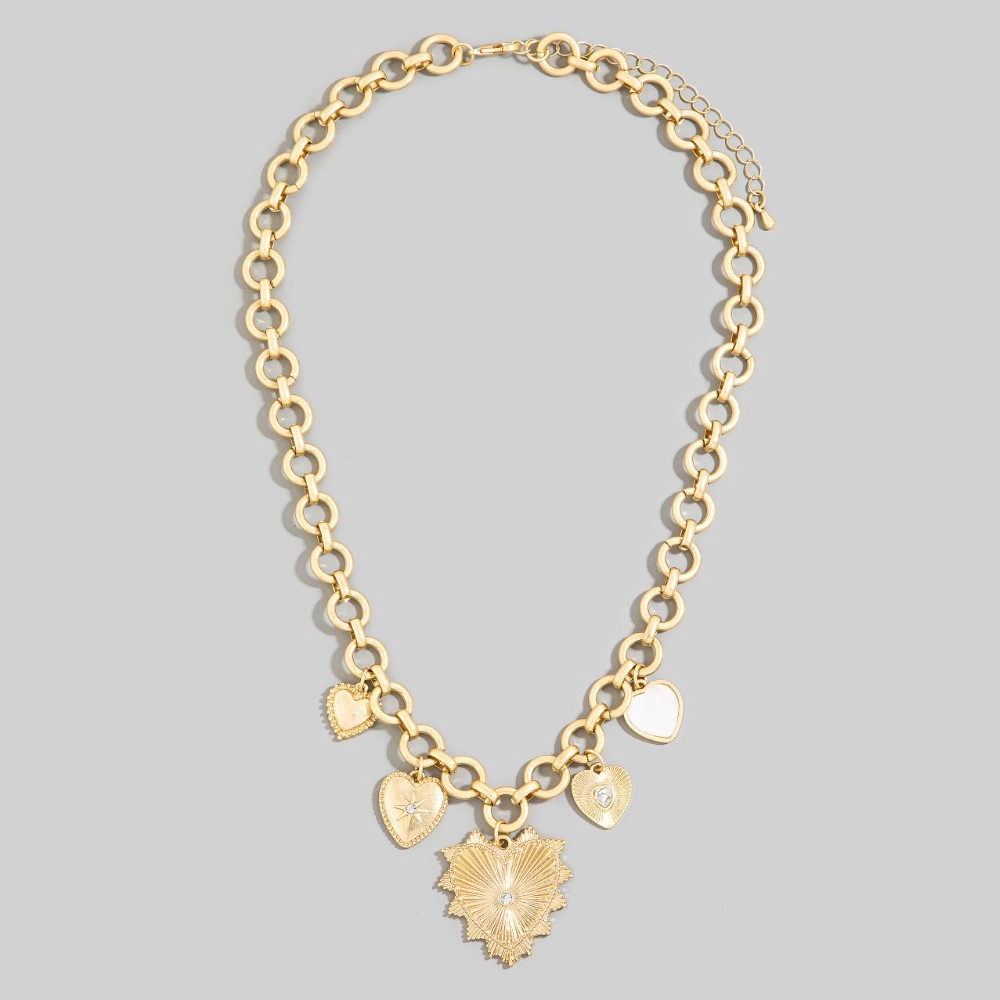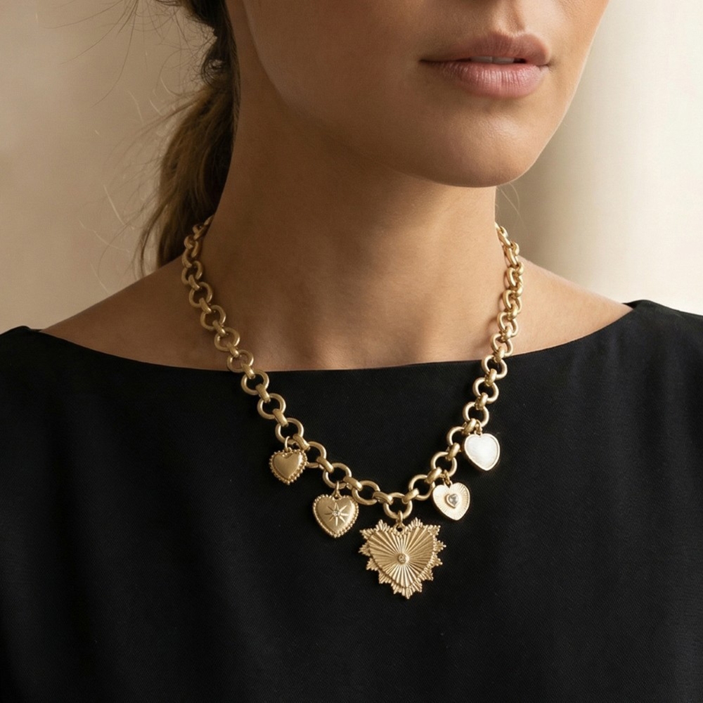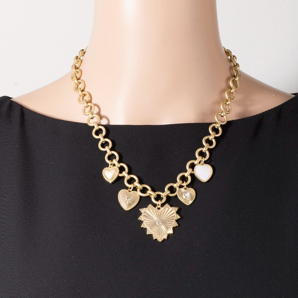 The perfect way to add some sparkle to your outfit, this chain necklace exudes a refined multi heart charms hoop design. Perfect for any occasion, this versatile chain necklace will enhance any outfit you wear. Available in WG. This item is sold in packs of 1.