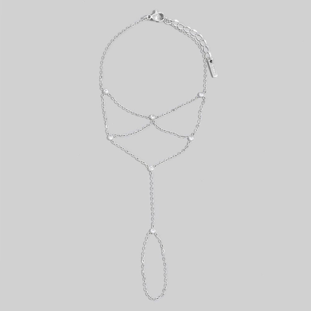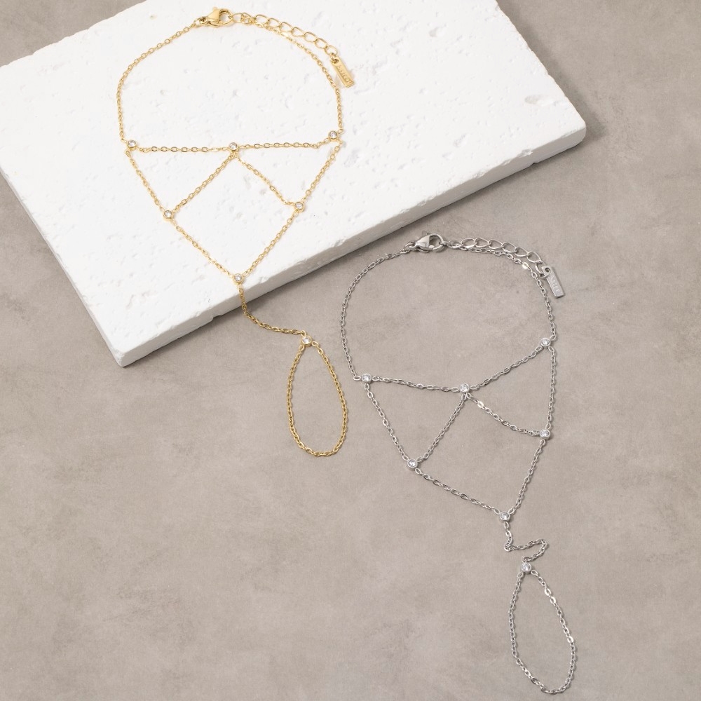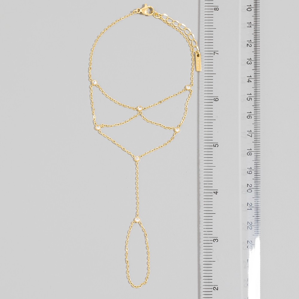 - This piece is both timeless and on-trend, this bracelet flaunts a luxurious multi-strand cubic zirconia bezel drape hand chain finger ring design. A perfect addition to your wardrobe that effortlessly enhances your style. Available in GD, RH. This item is sold in packs of 1.
