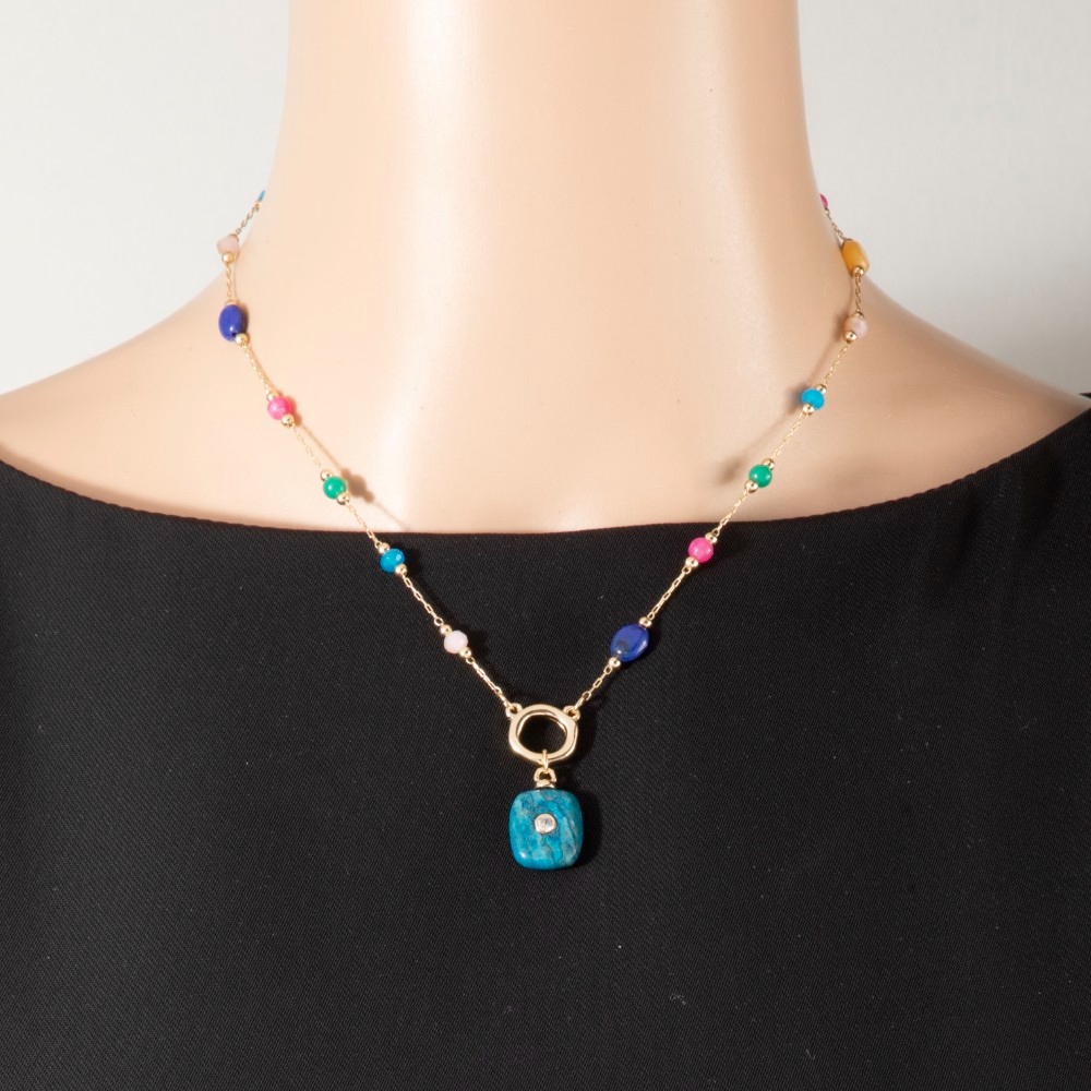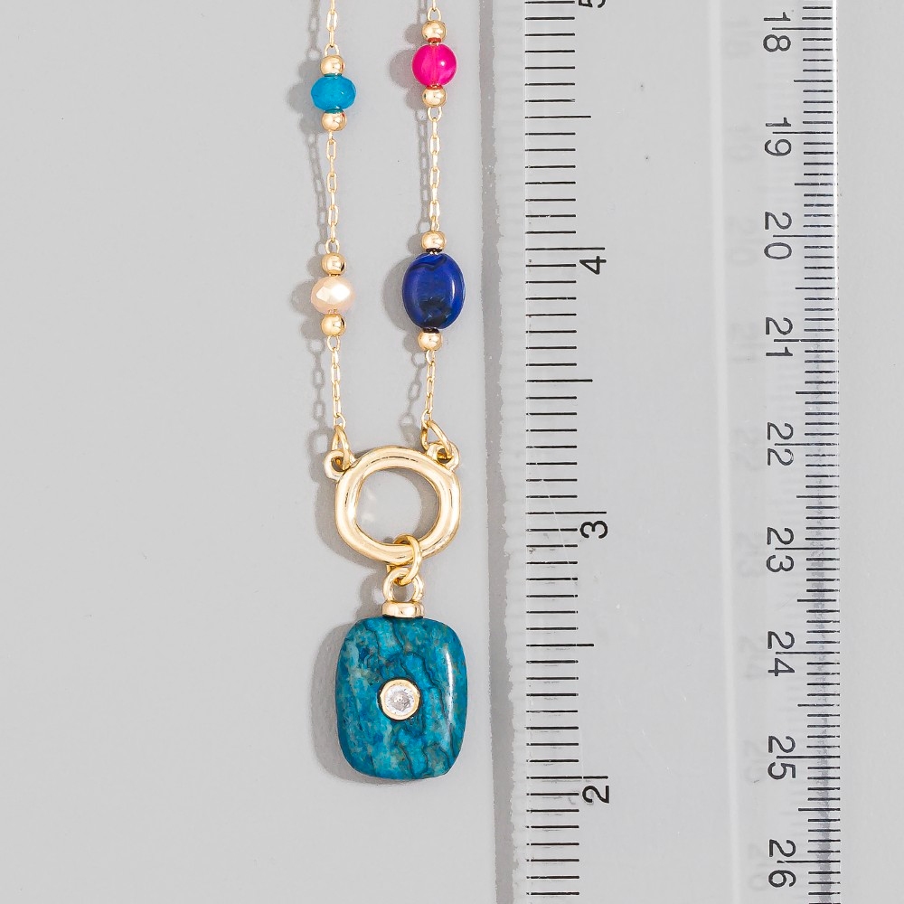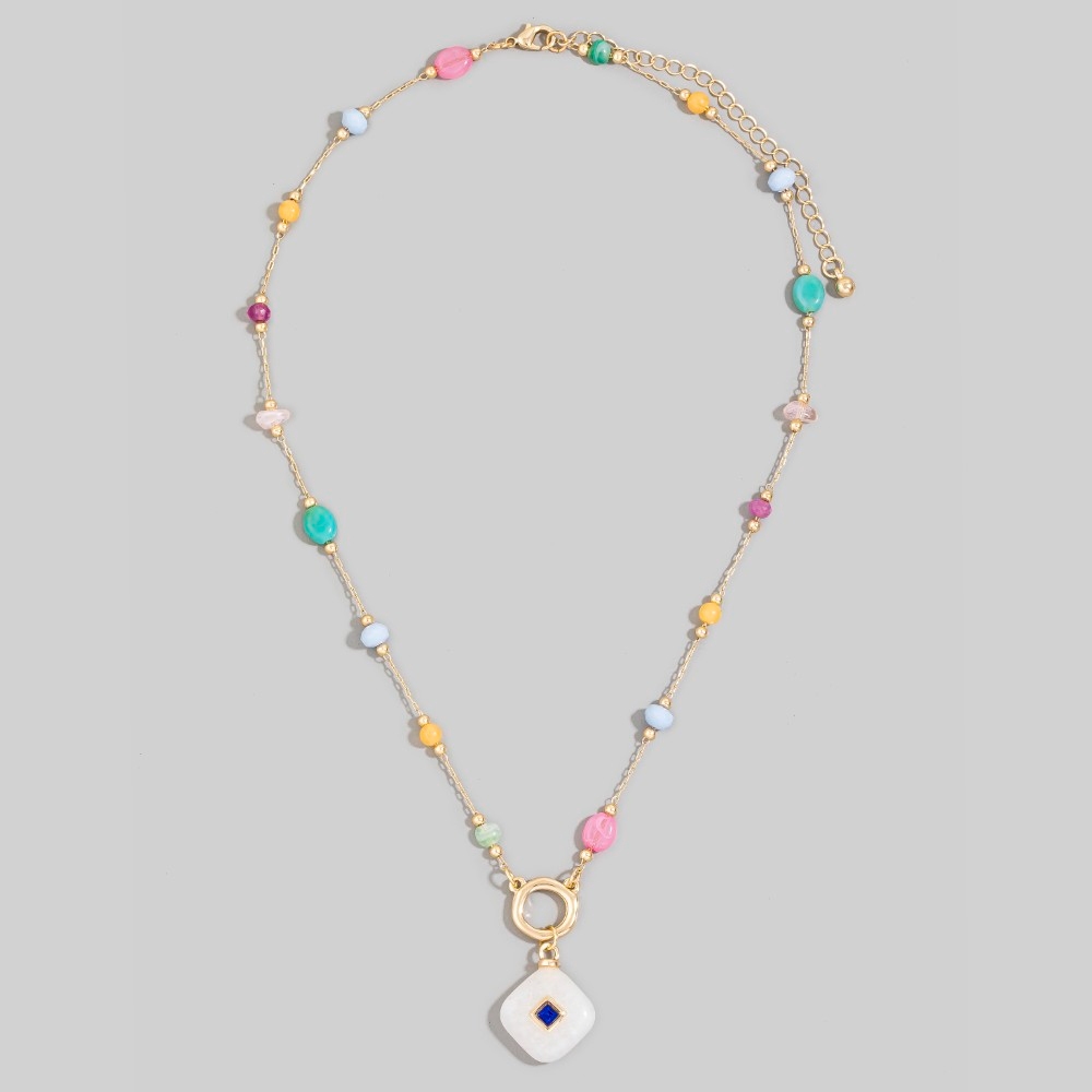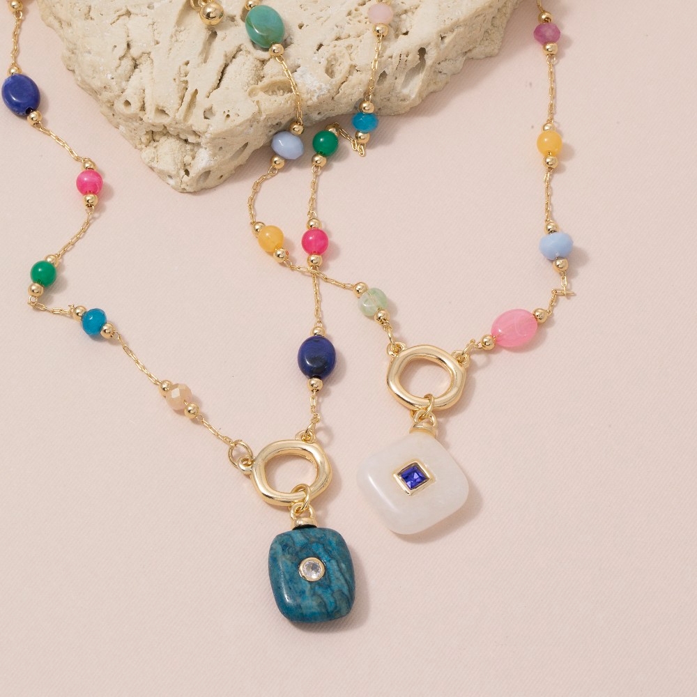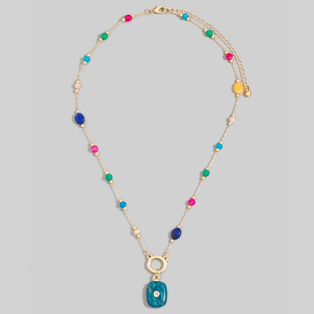 A stunning piece that is sure to turn heads, this pendant necklace displays a unique multicolor stone pendant station necklace design. Infuse a hint of luxury into your daily attire with this versatile pendant necklace, a must-have for those who appreciate timeless elegance. Available in GDMT1, GDMT2. This item is sold in packs of 1.