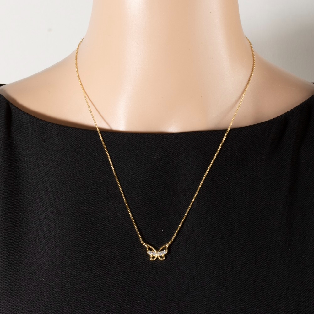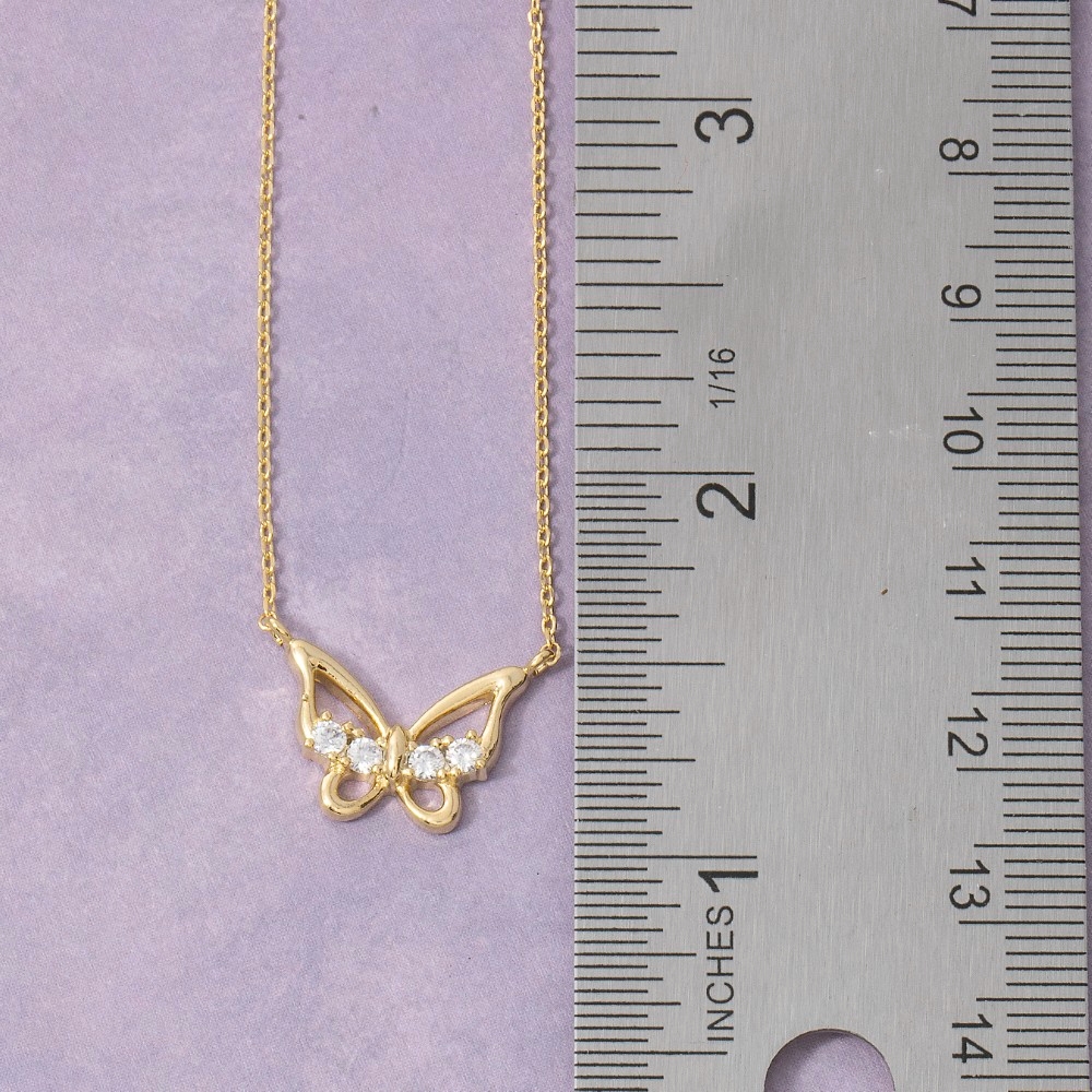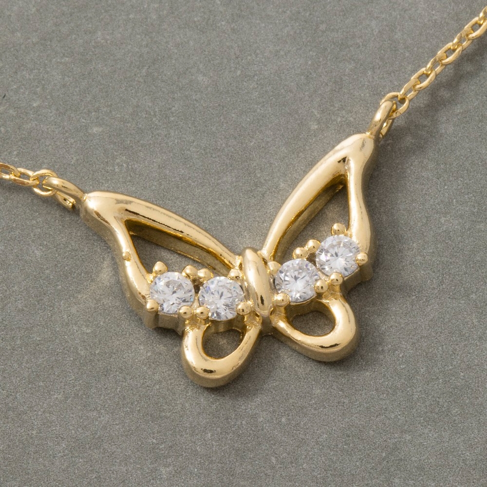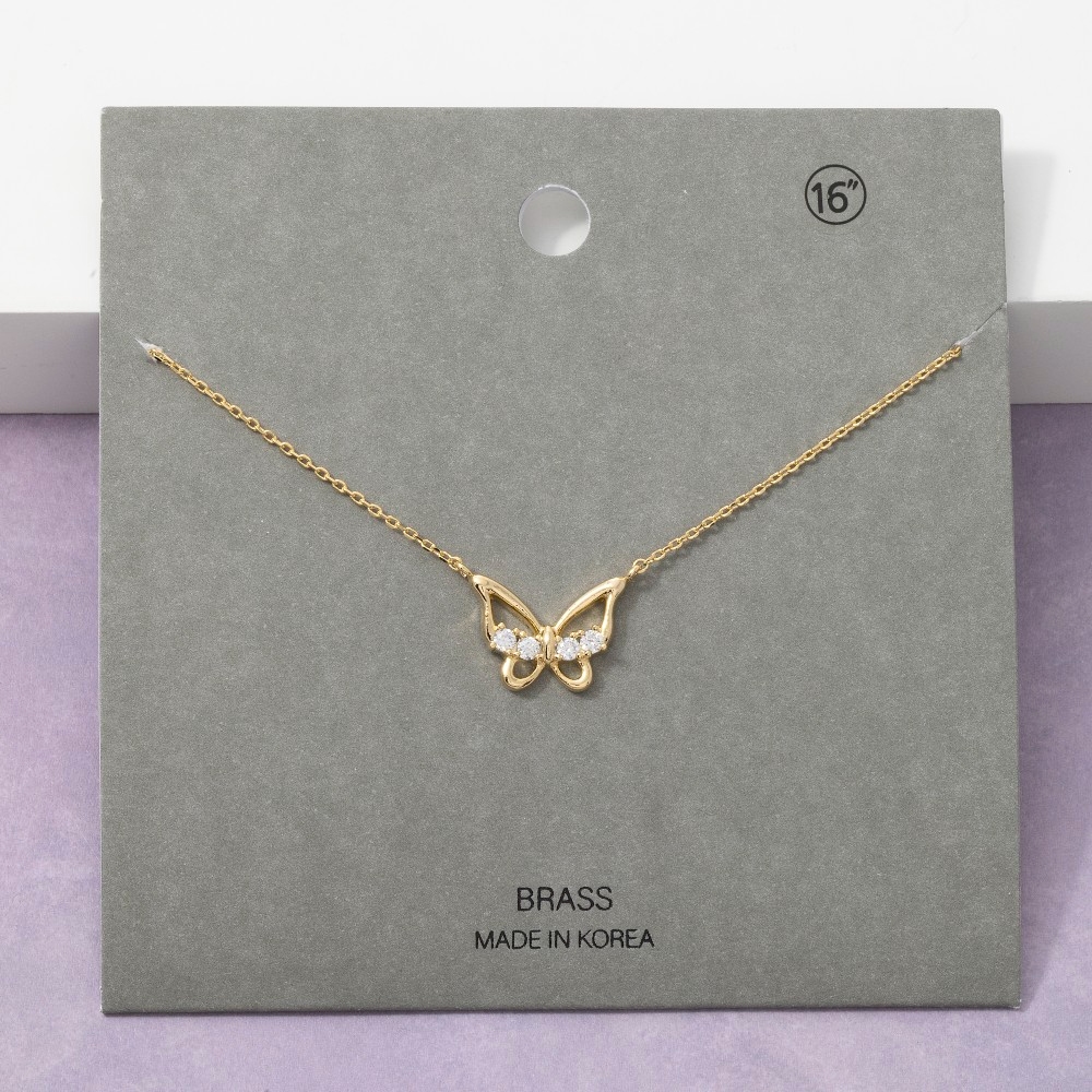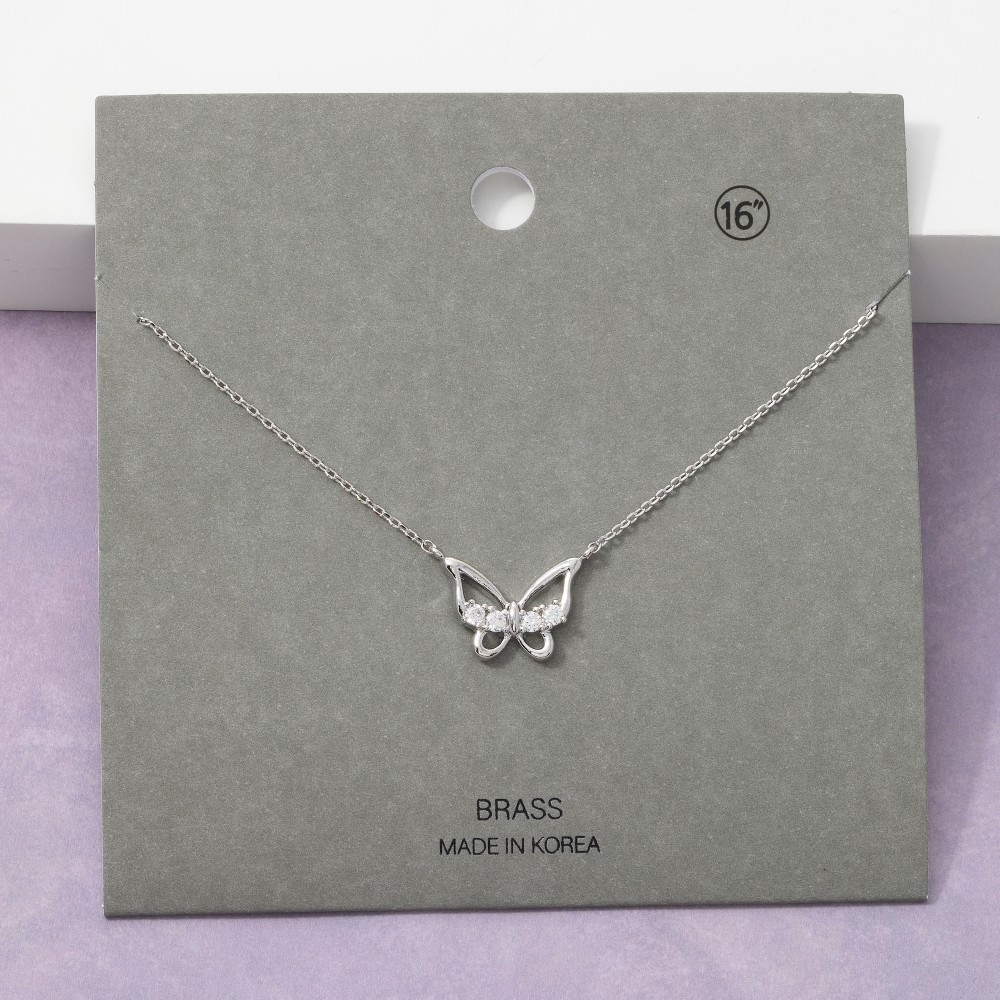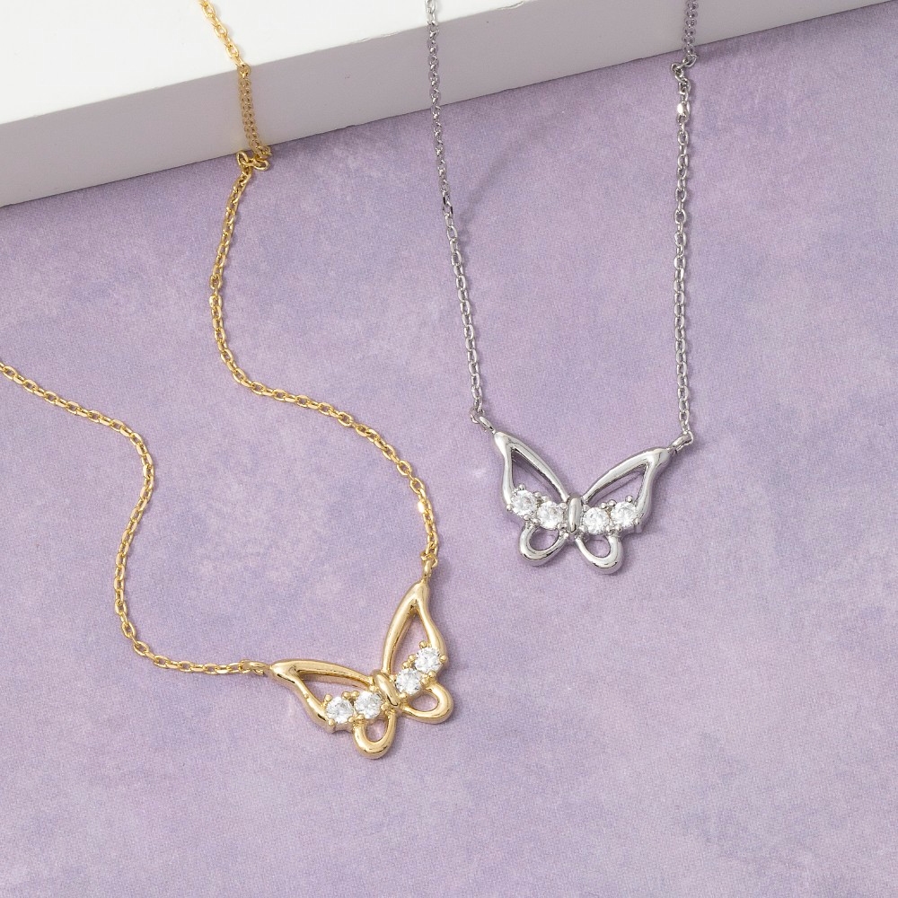 - A classic design with a contemporary twist, this pendant necklace showcases an alluring open butterfly cubic zirconia design. Add a dash of sophistication to your look with this versatile pendant necklace, a must-have for fashion enthusiasts. Available in GDCRY, RHCRY. This item is sold in packs of 1.