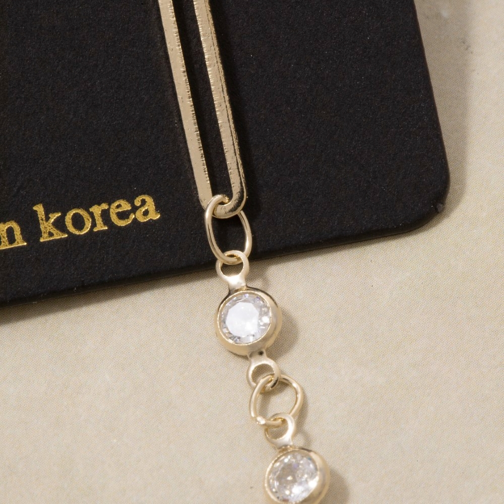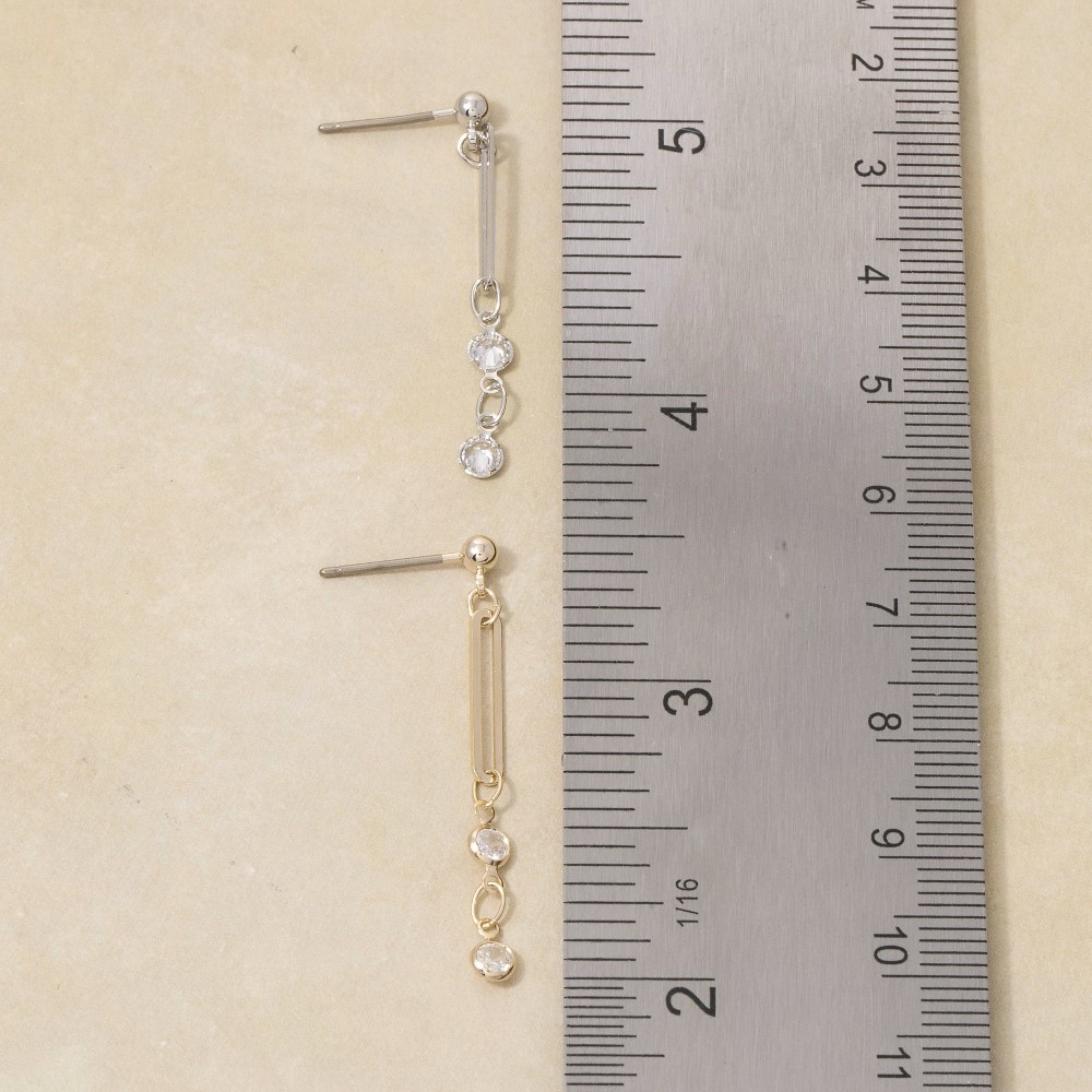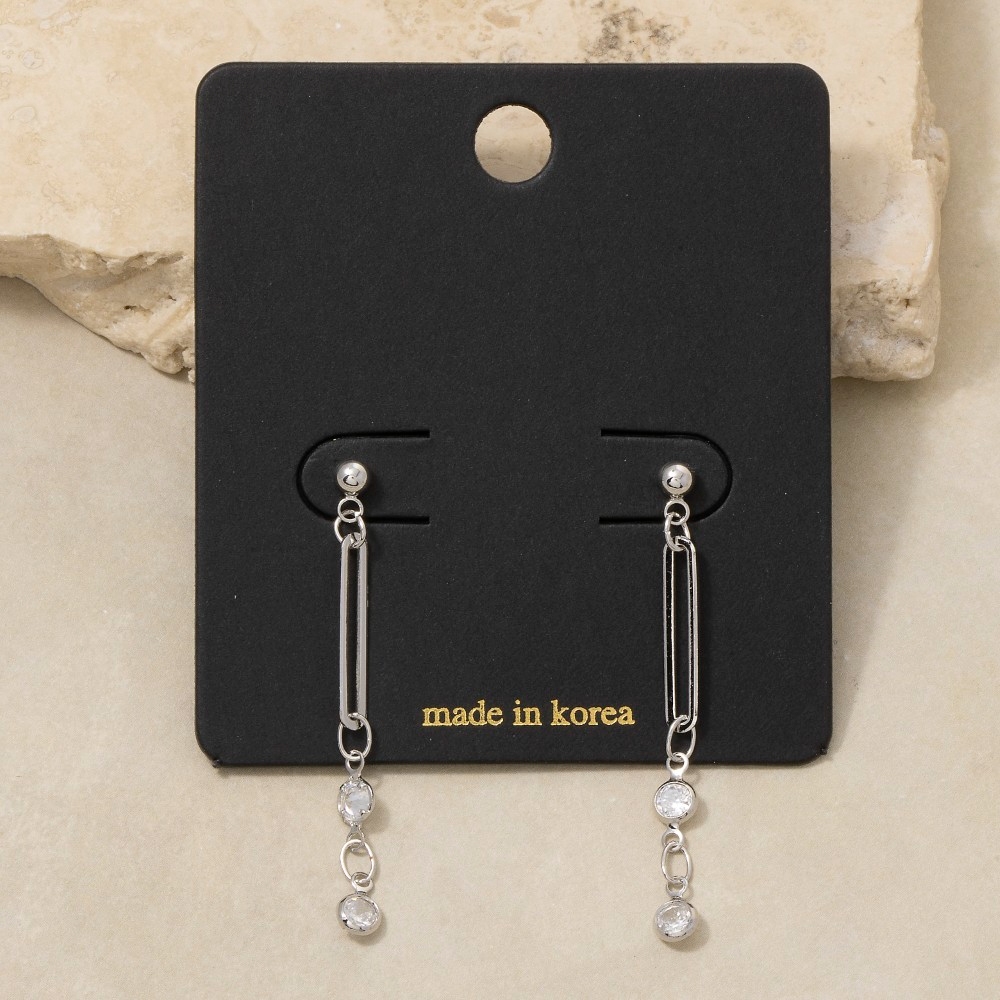 This pair of drop earrings is made with 50% Steel, 25% Brass and 25% Cubic Zirconia.
