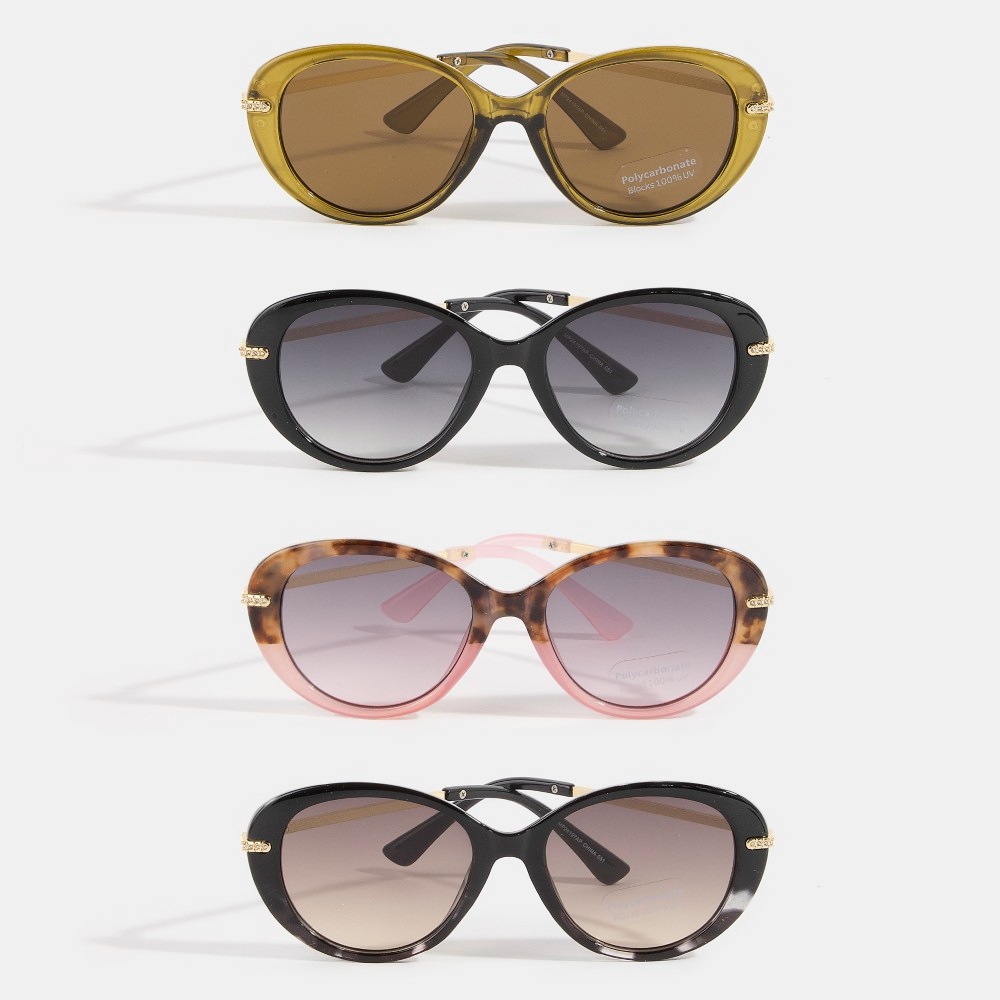 A versatile and stylish addition to any wardrobe, this set of sunglasses brings a one-of-a-kind oval cat-eye crystal accent sunglasses design. This item adds the perfect finishing touch to any outfit, making it stand out from the crowd. This item is sold in packs of 12.