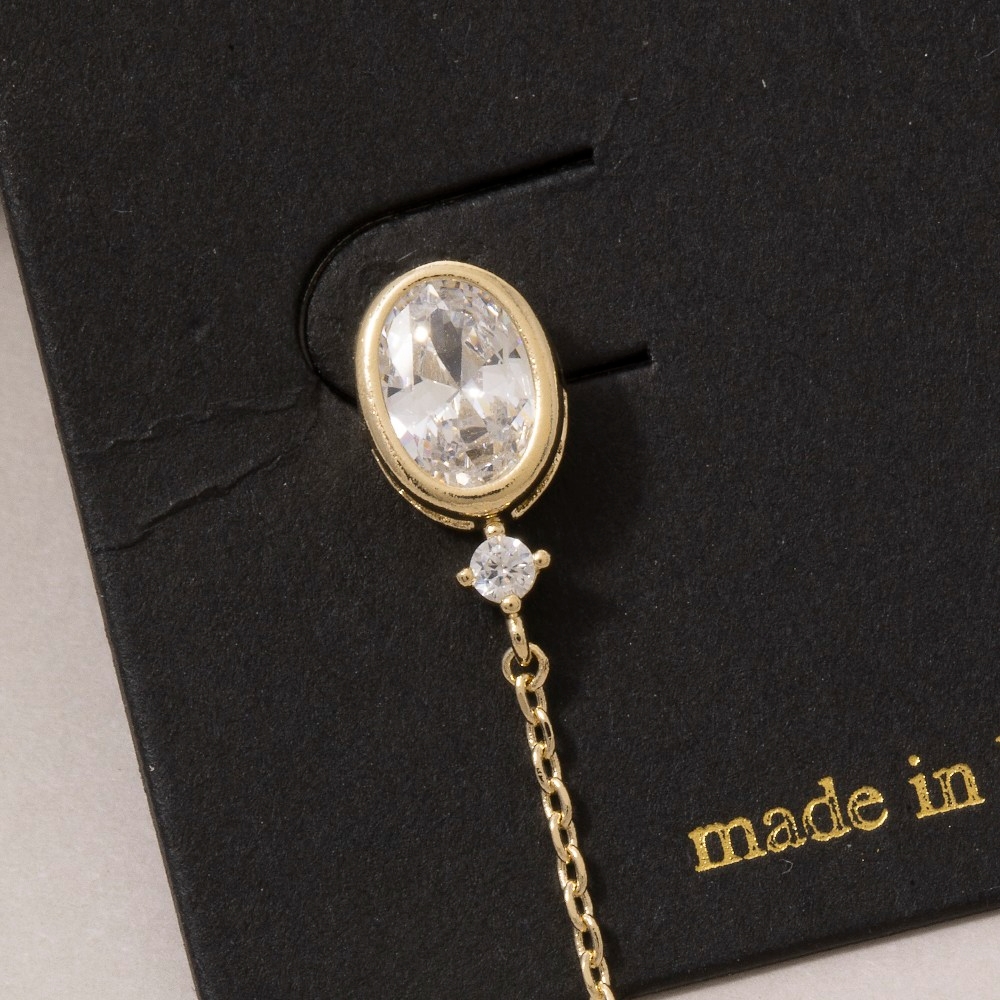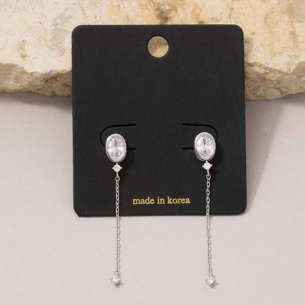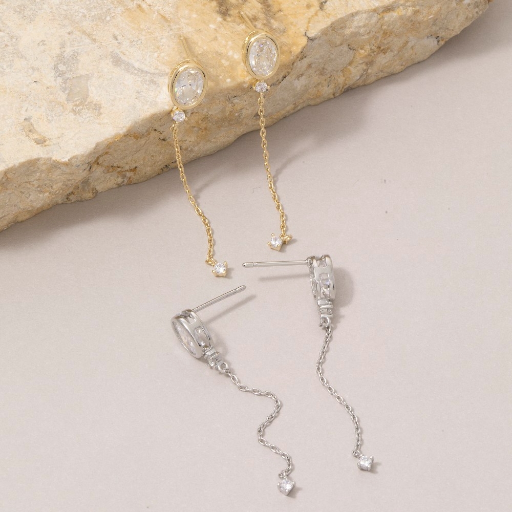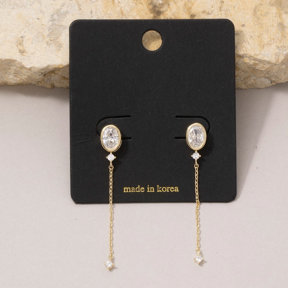 - Perfect for any fashion-forward individual, this pair of drop earrings showcases a breathtaking oval cubic zirconia bezel stud with long chain tassel design. Infuse a hint of luxury into your daily attire with this versatile pair of drop earrings, a must-have for those who appreciate timeless elegance. Available in G, S. This item is sold in packs of 1.