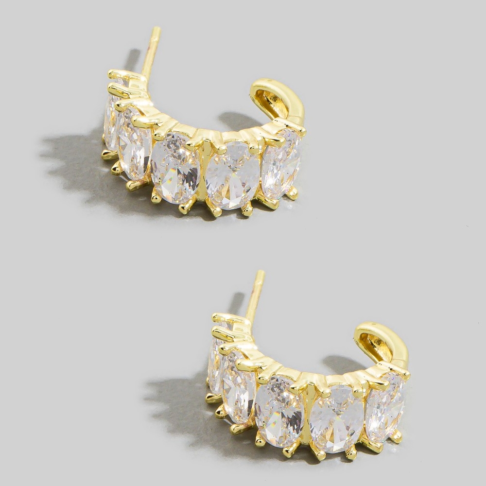 • Add a touch of elegance and glamour to your look, this pair of hoop earrings radiates a sleek oval cubic zirconia tennis huggie design. This versatile pair of hoop earrings adds a touch of elegance to any outfit. Available in G, RH. This item is sold in packs of 1.