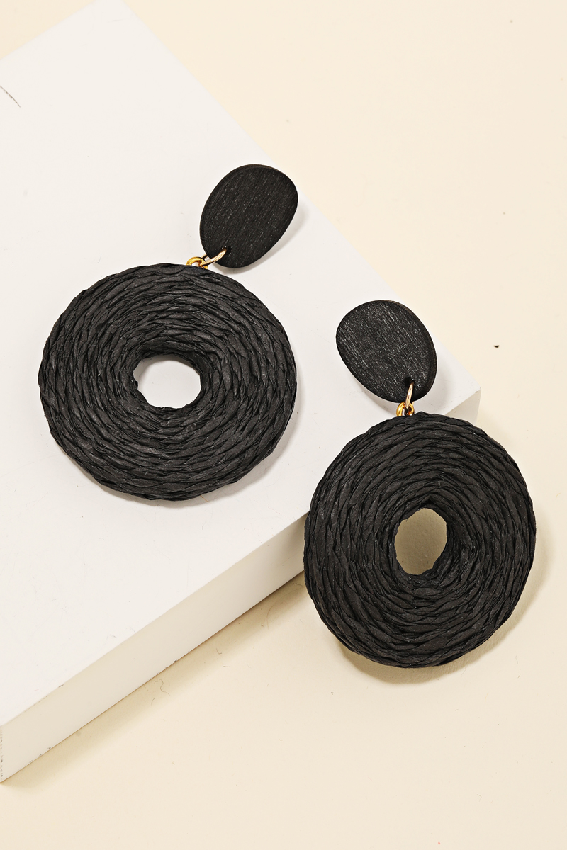 Effortlessly elevate your style, this pair of dangle earrings incorporates a remarkable paper braided hoop design. Discover the magic of accessorizing with this versatile pair of dangle earrings, effortlessly upgrading the style quotient of any outfit. Available in BG, BK, IVY, LBR, NAV, YEL, PUM and SAGE. This item is sold in packs of 1.