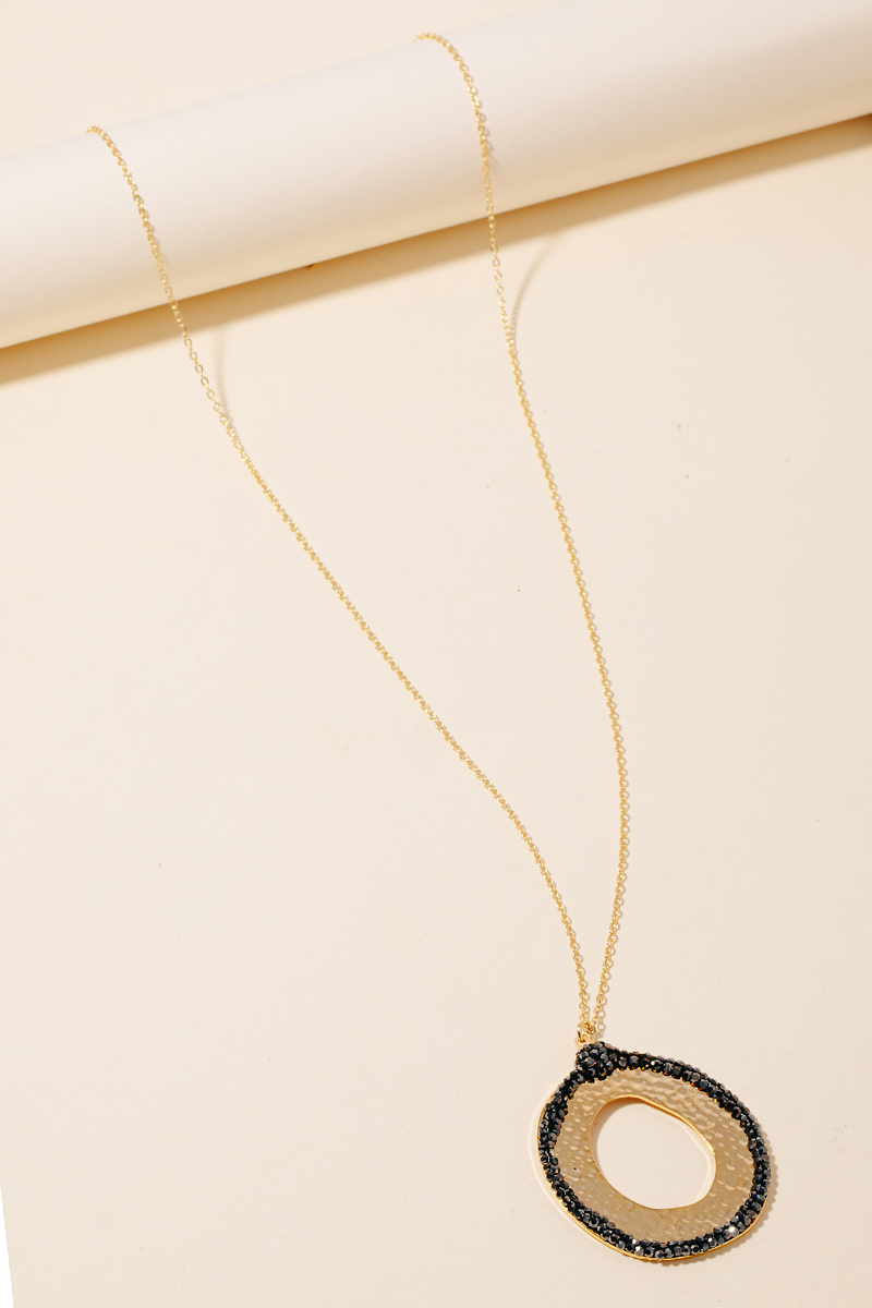 • This necklace showcases a unique pave studded hammered flat hoop pendant style. Witness the transformative power of accessories as this piece effortlessly redefines your fashion narrative.