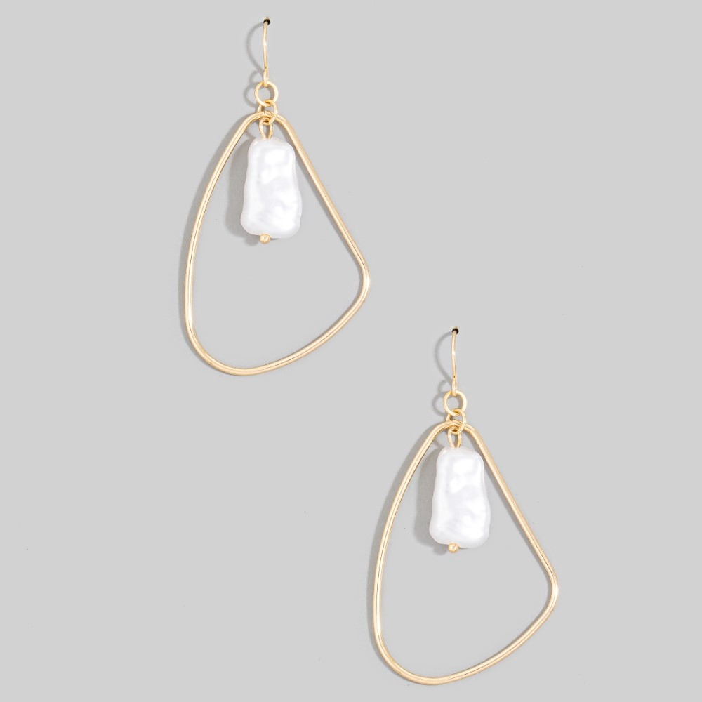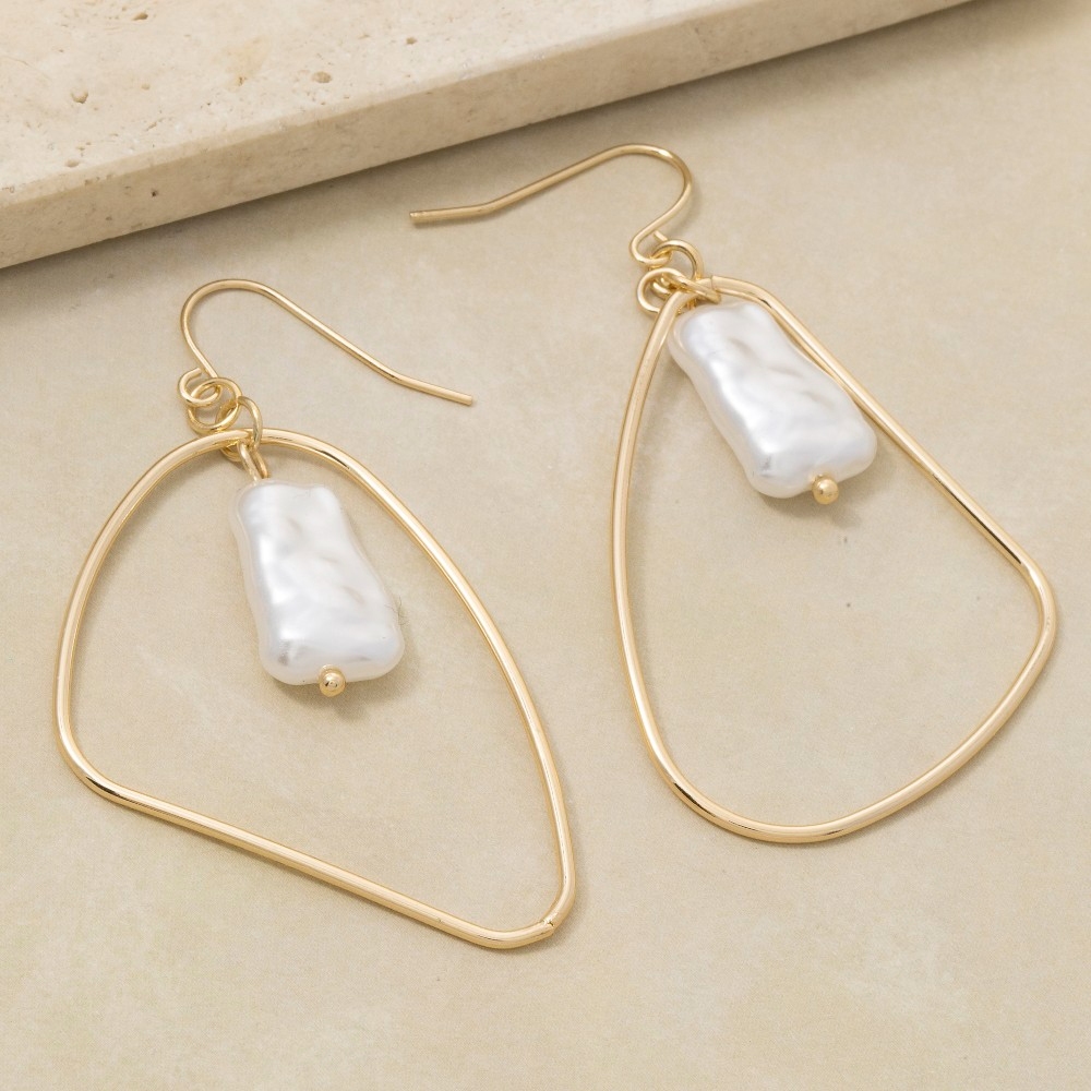 This piece is both timeless and contemporary, this pair of dangle earrings encompasses a grand pearl bead irregular tear design. Make a lasting impression with this versatile pair of dangle earrings, a subtle yet impactful addition to your fashion repertoire. Available in GP. This item is sold in packs of 1.