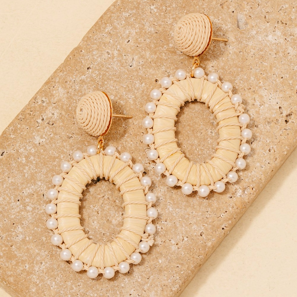 - The perfect way to elevate any outfit, this pair of dangle earrings contains a special pearl beads rattan wrap oval hoop design. A stylish pair of dangle earrings that's perfect for complementing your favorite outfit. Available in MIVG4. This item is sold in packs of 1.