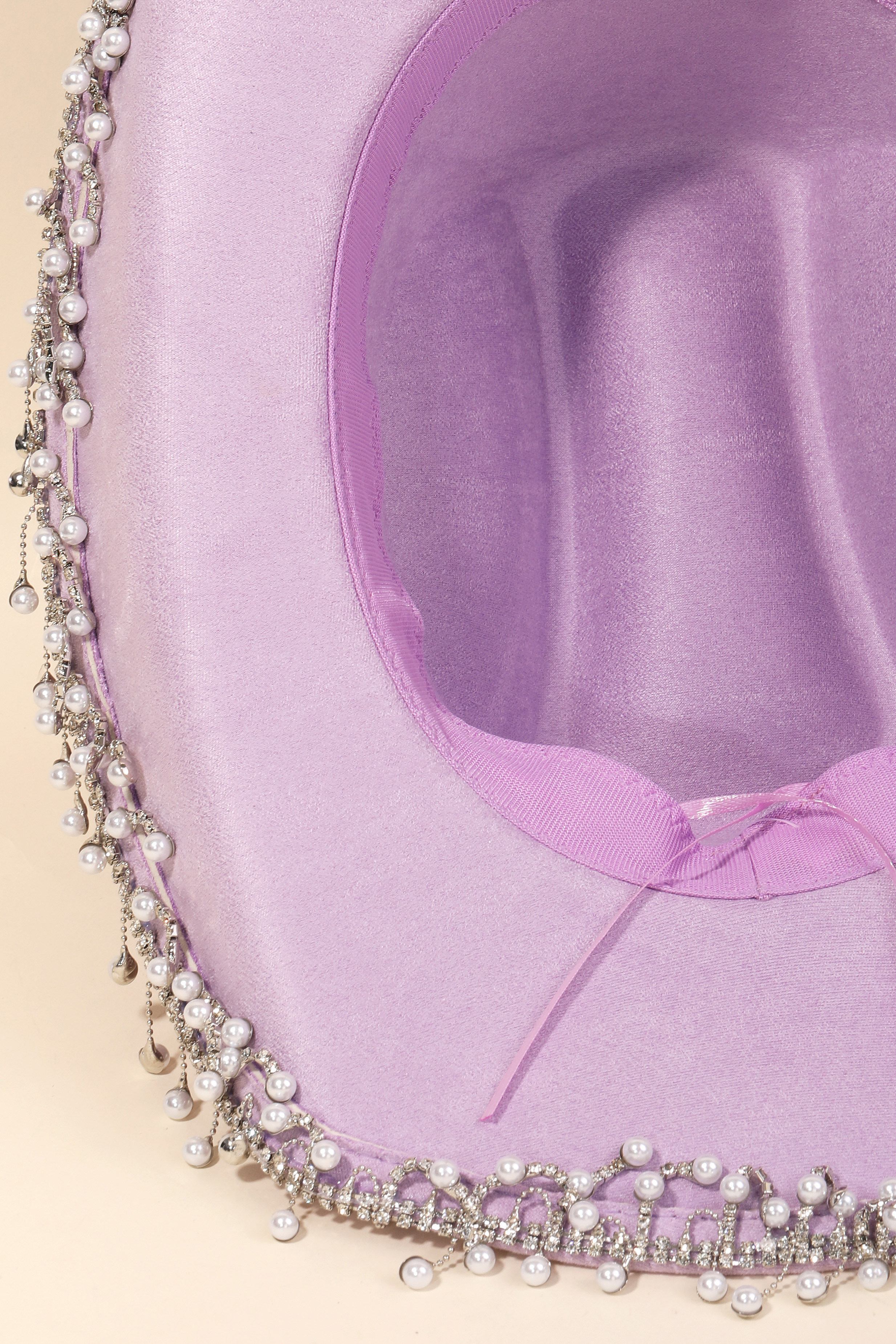 - Make a bold statement, this cowboy hat carries a charming pearl rhinestone fringe trim design. This item is ideal for those who want to add some personality to their outfits without being too bold. Available in BK, IV, LPK, NPK, PU, IVFN and LV. This item is sold in packs of 1.