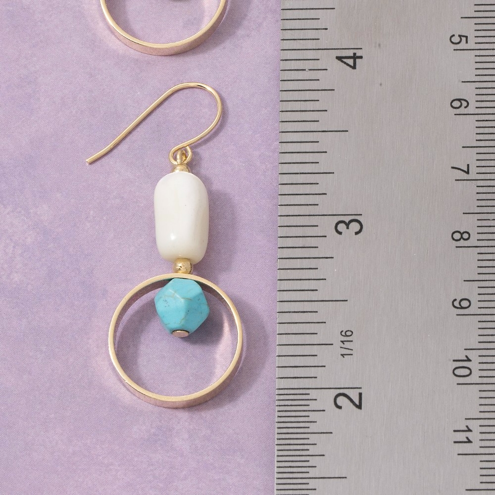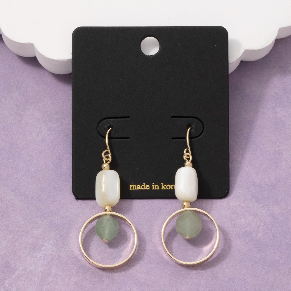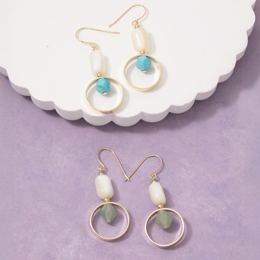 • This pair of dangle earrings is made with 20% Brass, 50% Shell and 30% Gemstone.