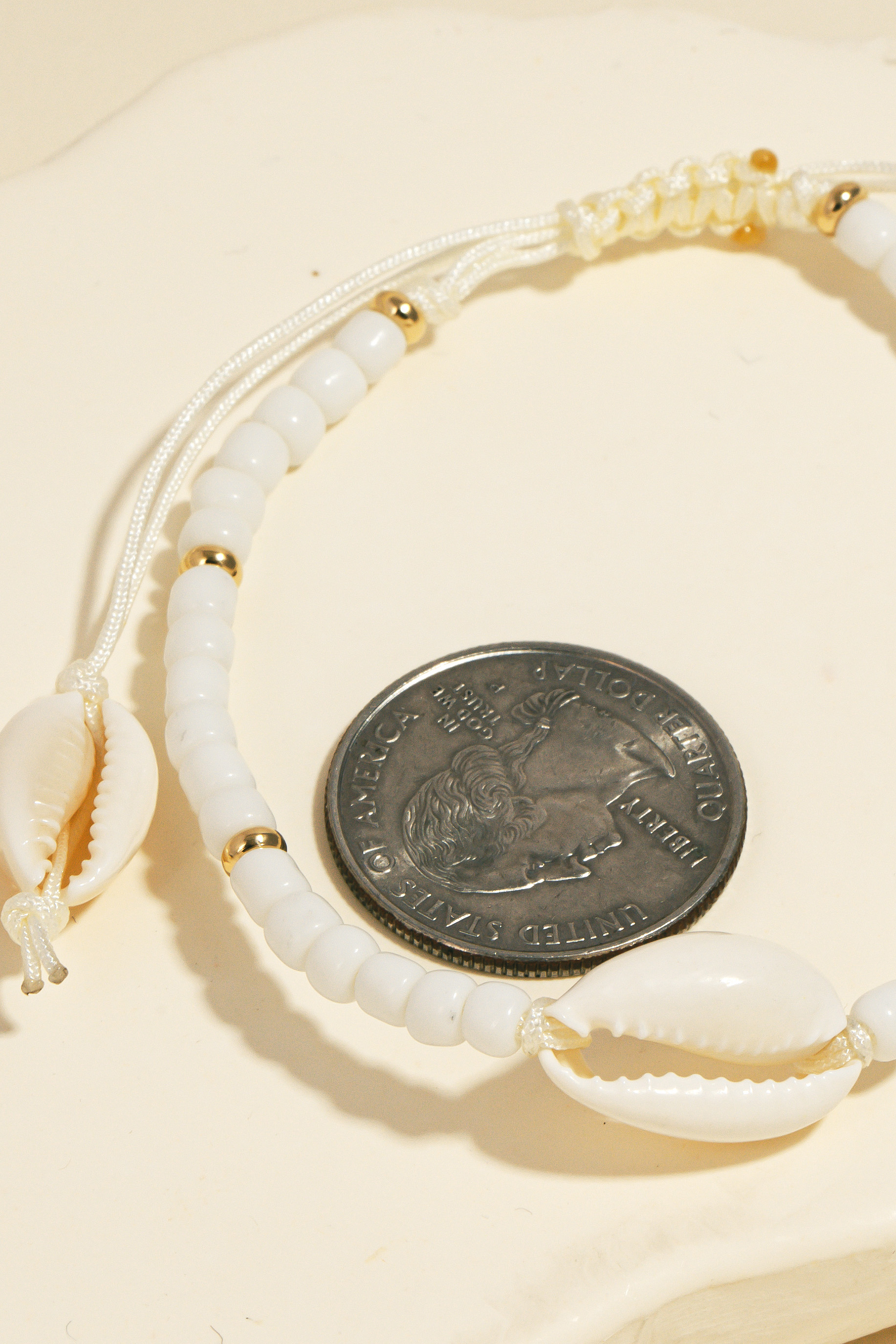 This bracelet is made with 10% Copper, 20% Shell, 60% Glass Bead and 10% Rope.