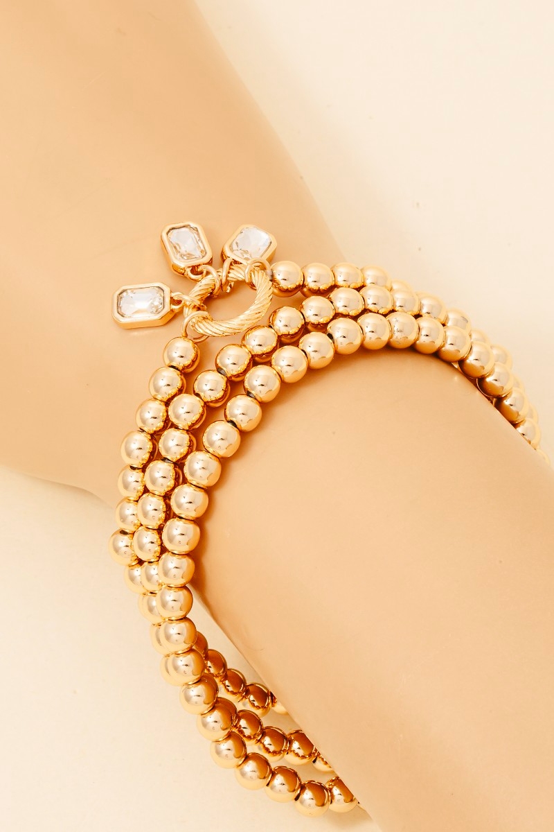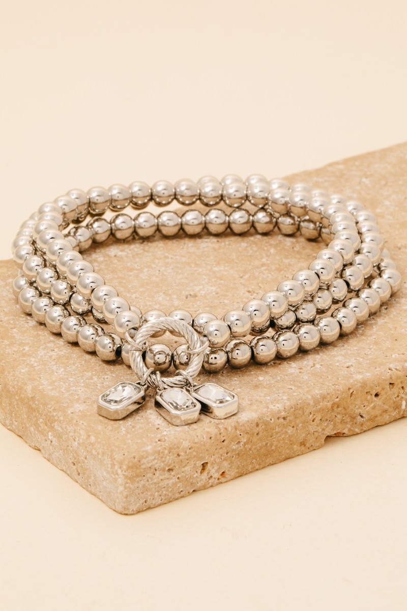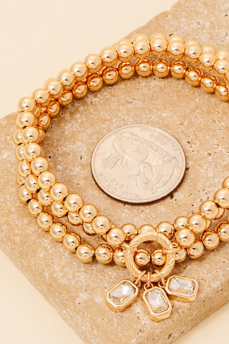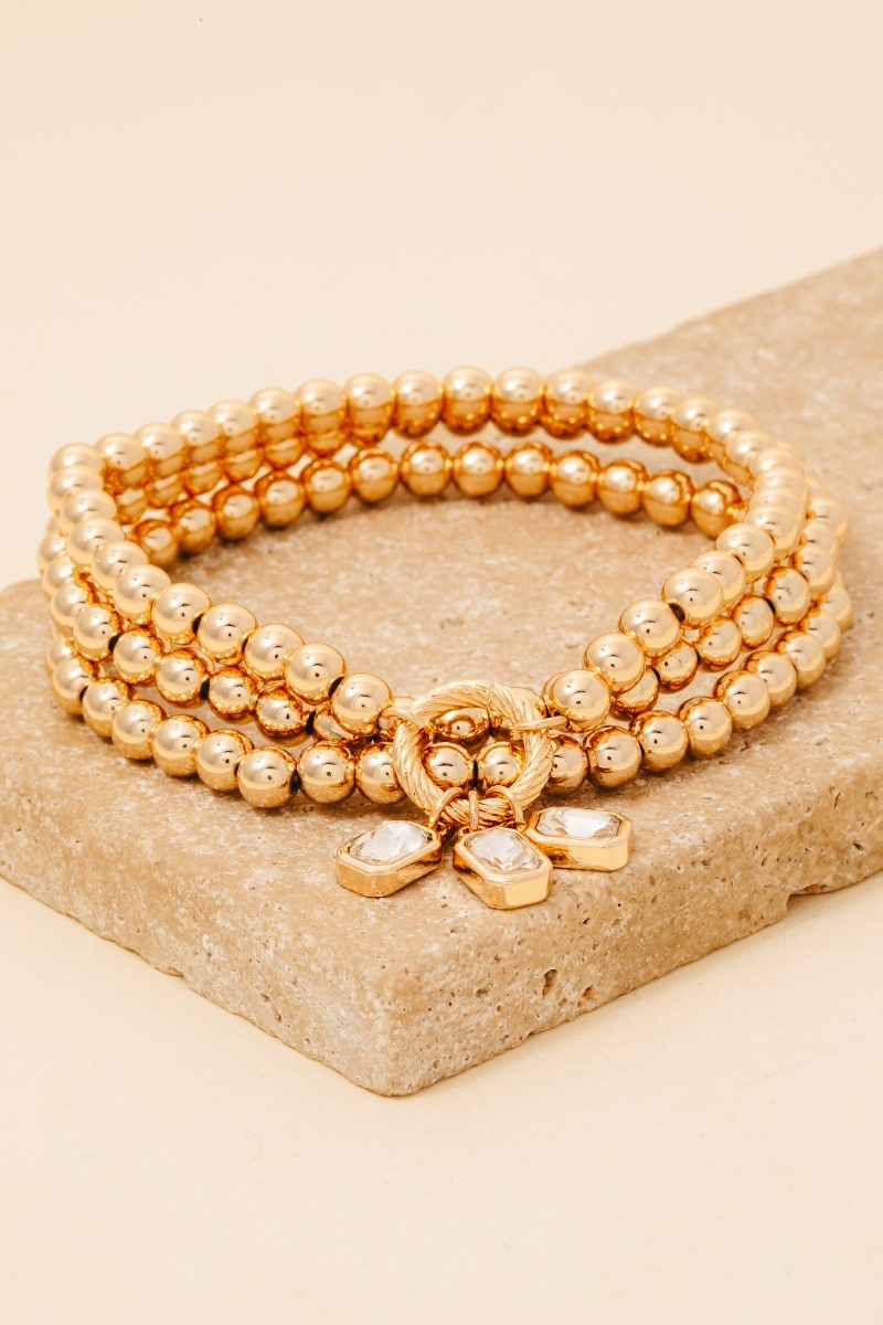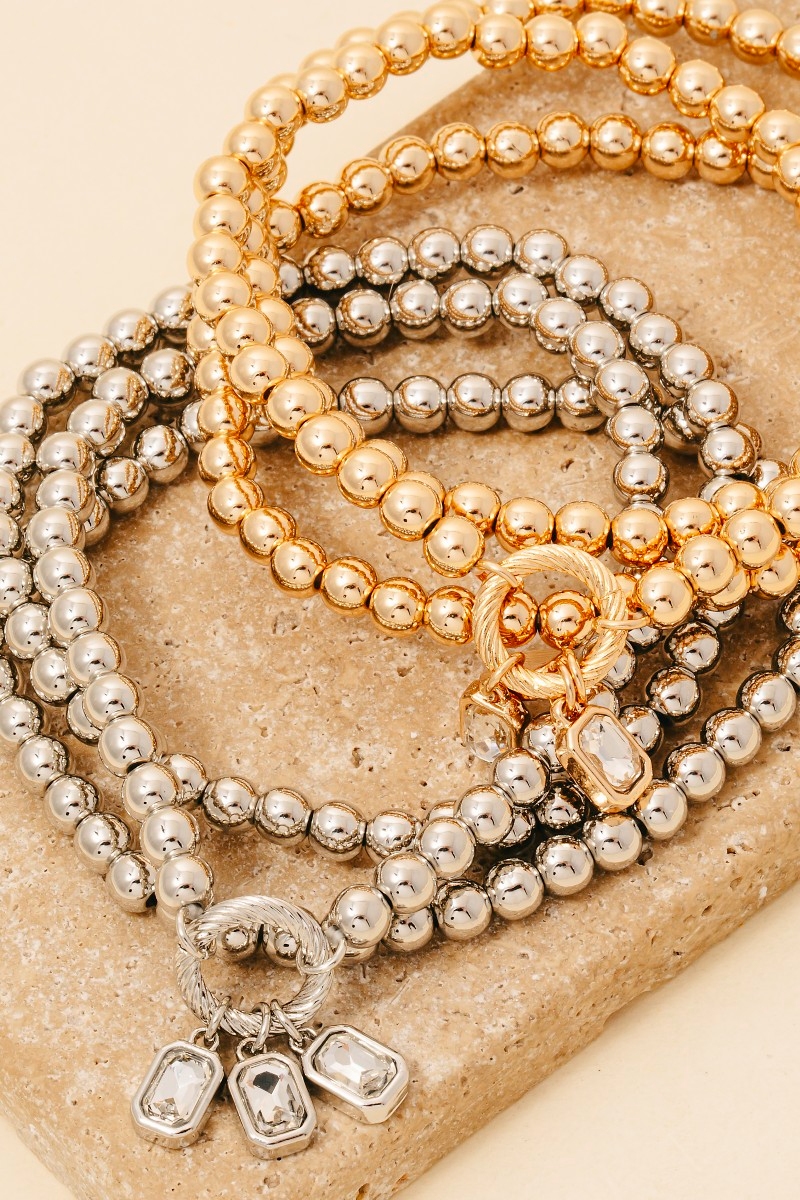 • This bracelet displays a fashionable rhinestone charms metallic beaded set style. Immerse yourself in the world of understated glamour as this bracelet effortlessly exudes timeless appeal.
