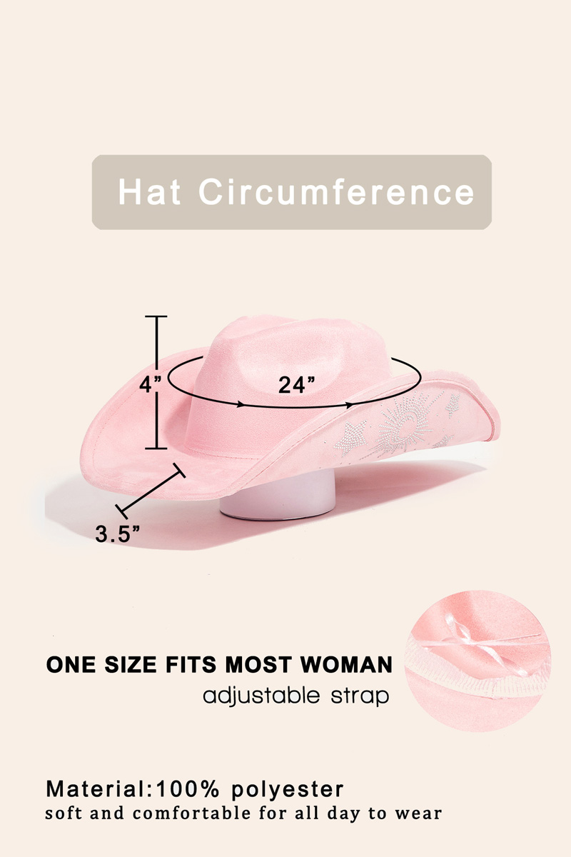 The perfect way to add some sparkle to your outfit, this cowboy hat incorporates a flawless rhinestone moon and star embroidered design. This cowboy hat is ideal for both casual and formal events, adding a touch of sophistication to any outfit. Available in BK, IV, LBL, PK. This item is sold in packs of 1.