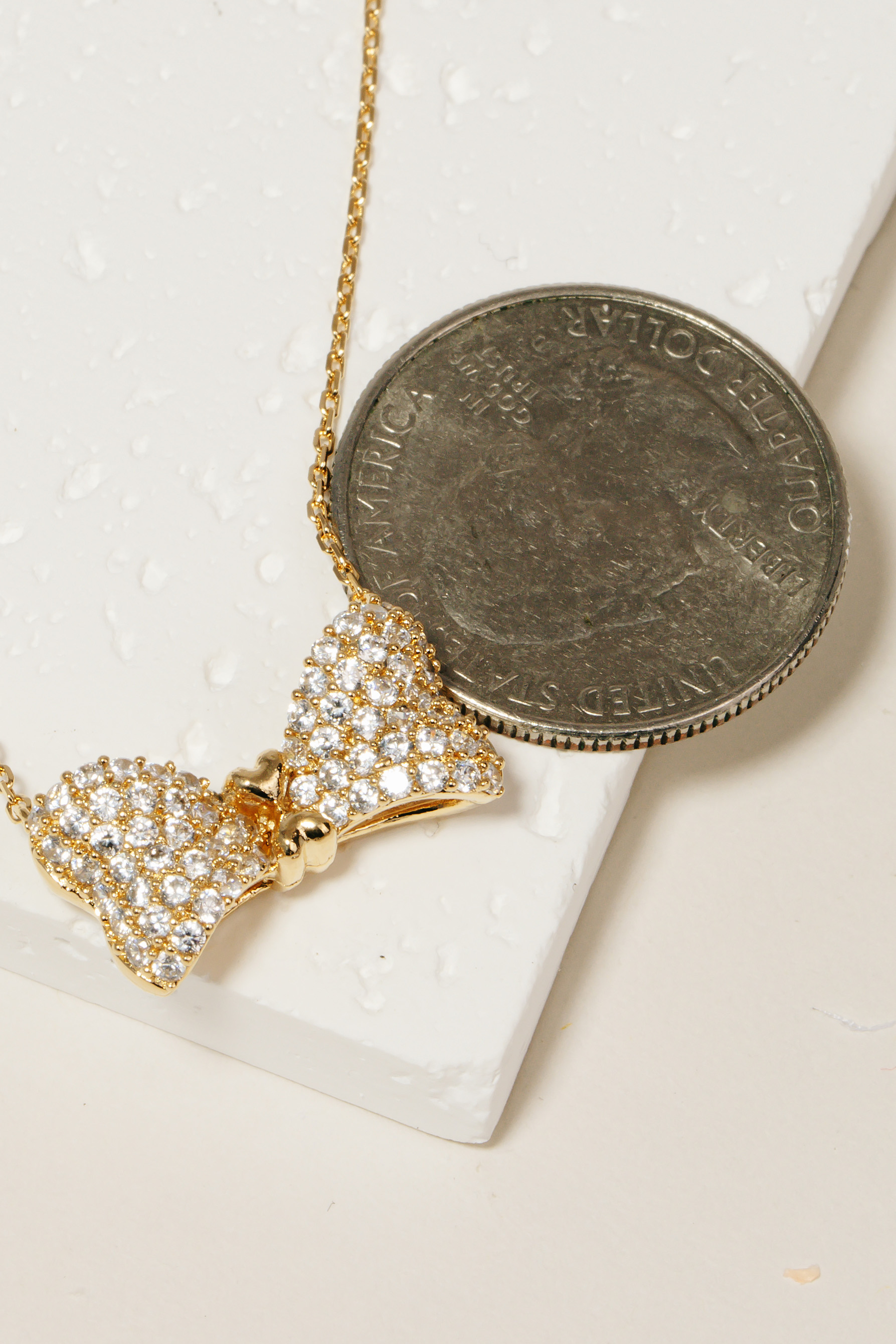 - Stay on-trend and stand out from the crowd, this necklace possesses a fine rhinestone pave ribbon bow pendant design. Infuse a hint of luxury into your daily attire with this versatile accessory, a must-have for those who appreciate timeless elegance. Available in G and S. This item is sold in packs of 2.