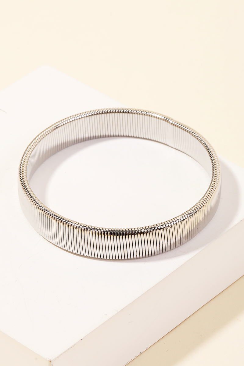 This season's must-have accessory, this bangle bracelet radiates a sleek ribbed stretch design. Discover a new level of fashion versatility as this accessory effortlessly elevates the allure of your attire. Available in G and S. This item is sold in packs of 1.