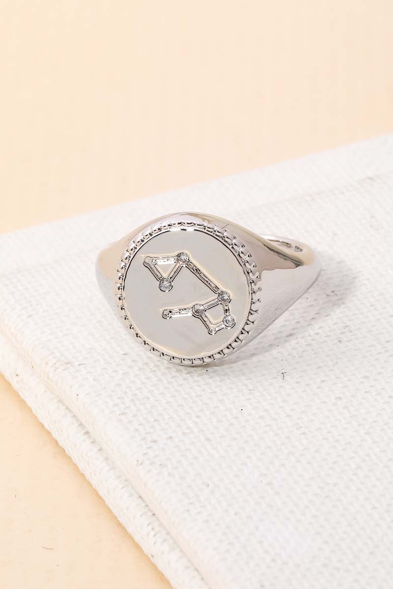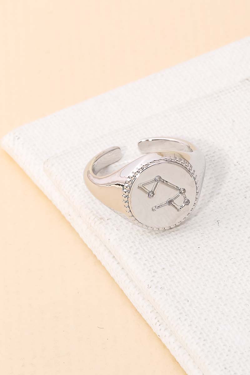 • An elegant, classy, chic and absolutely extravagant stunning must have open band signet ring that is made to be slightly adjustable. This gorgeous ring features a metallic polished shiny finish and a zodiac constellation engraved and studded at its top. This gorgeous ring is perfect for daily wear and can go with any outfit perfectly. This item is sold in packs of 1.