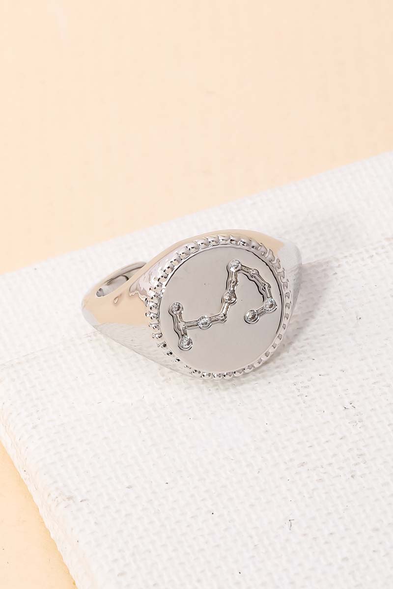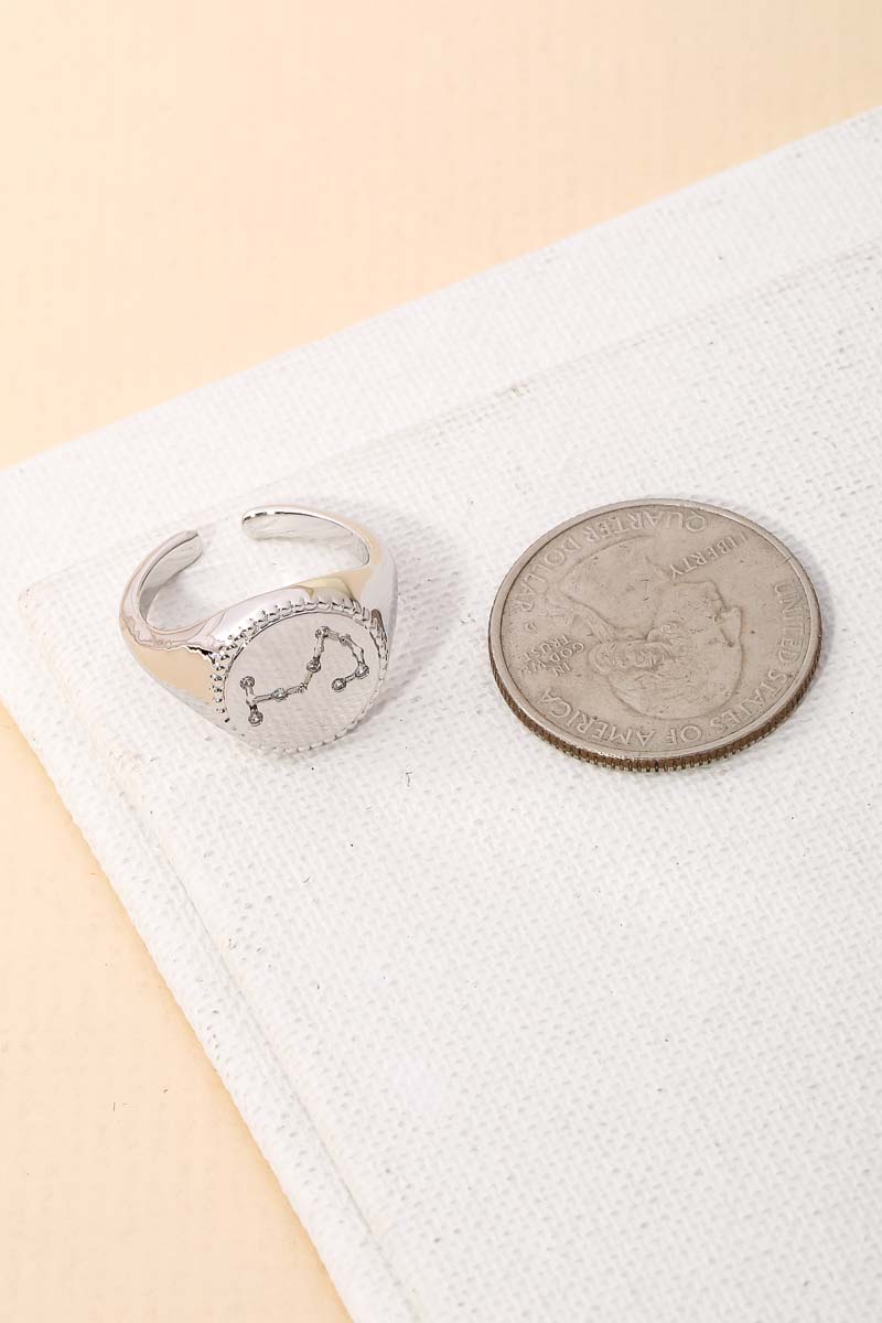 • An elegant, classy, chic and absolutely extravagant stunning must have open band signet ring that is made to be slightly adjustable. This gorgeous ring features a metallic polished shiny finish and a zodiac constellation engraved and studded at its top. This gorgeous ring is perfect for daily wear and can go with any outfit perfectly. This item is sold in packs of 1.