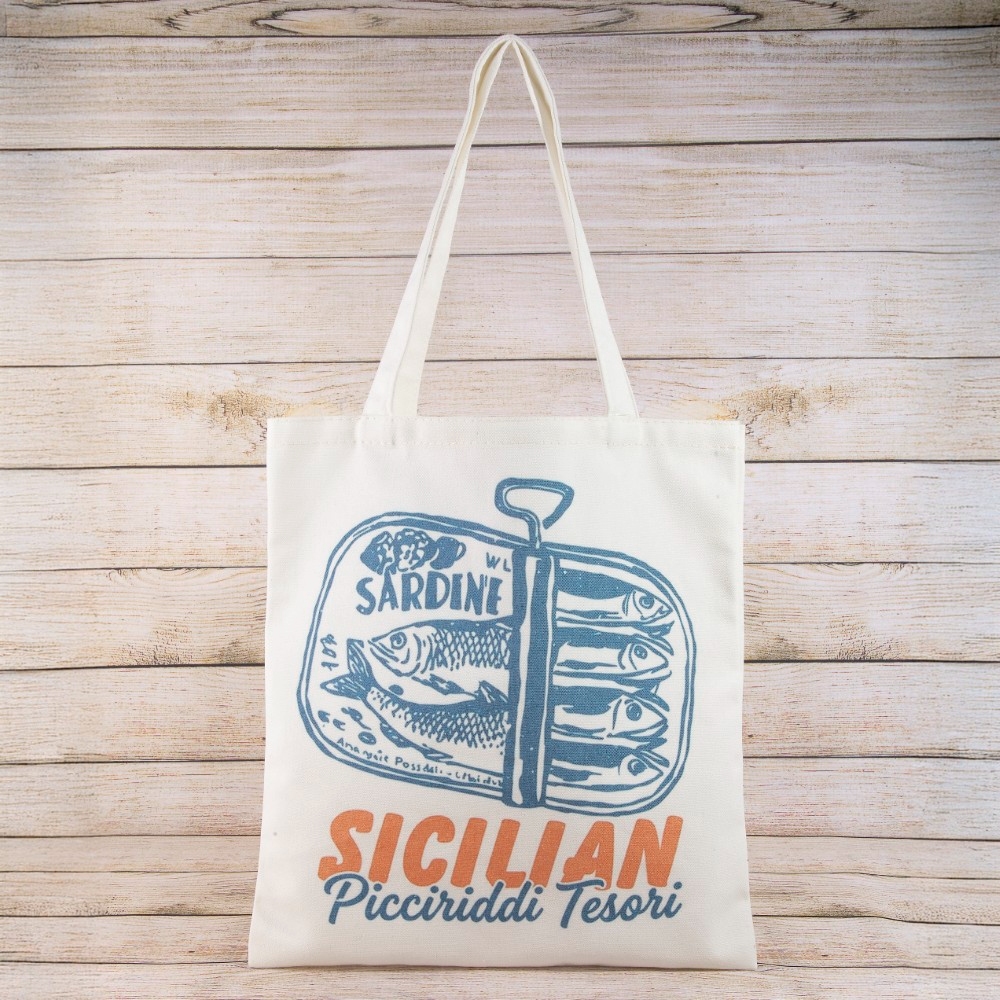 A bold and daring choice that is sure to impress, this tote bag adds a distinctive sicilian canned sardines design. Add a dash of sophistication to your look with this versatile tote bag, a must-have for fashion enthusiasts. Available in MU. This item is sold in packs of 1.